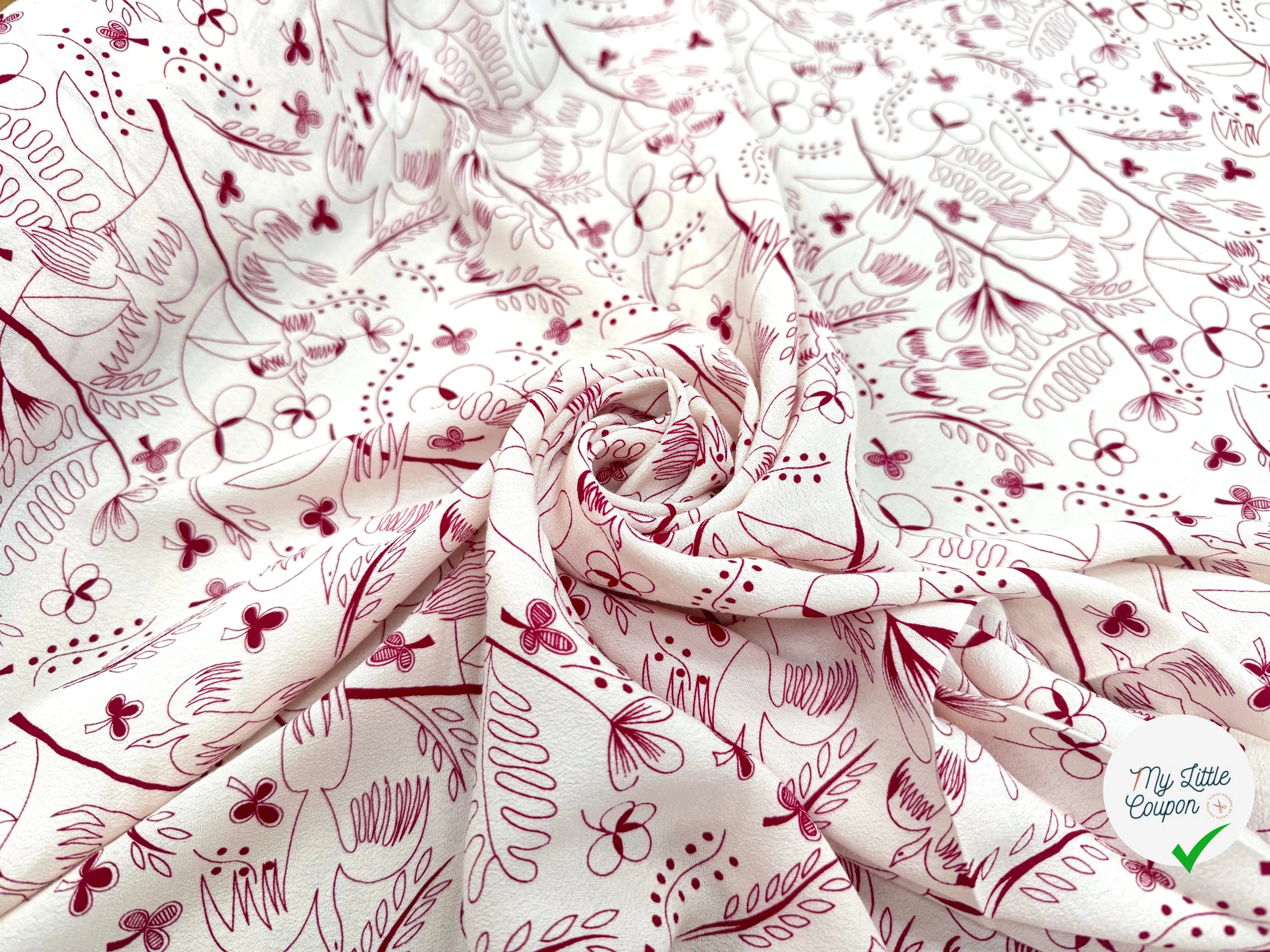 ARCHIVE - CRÊPE VISCOSE FOND BLANC MOTIFS COLOMBES ET TREFFLES ROSE