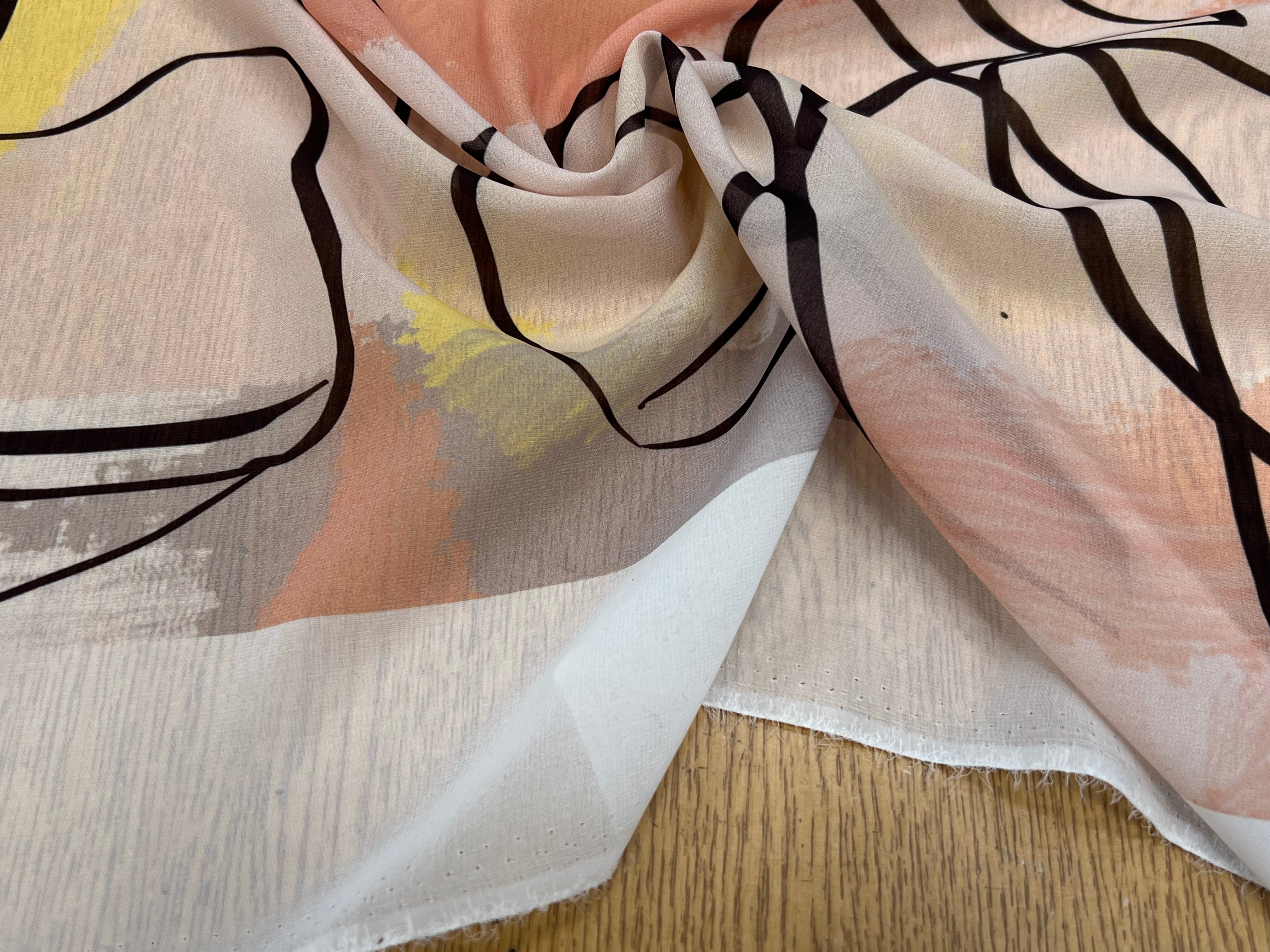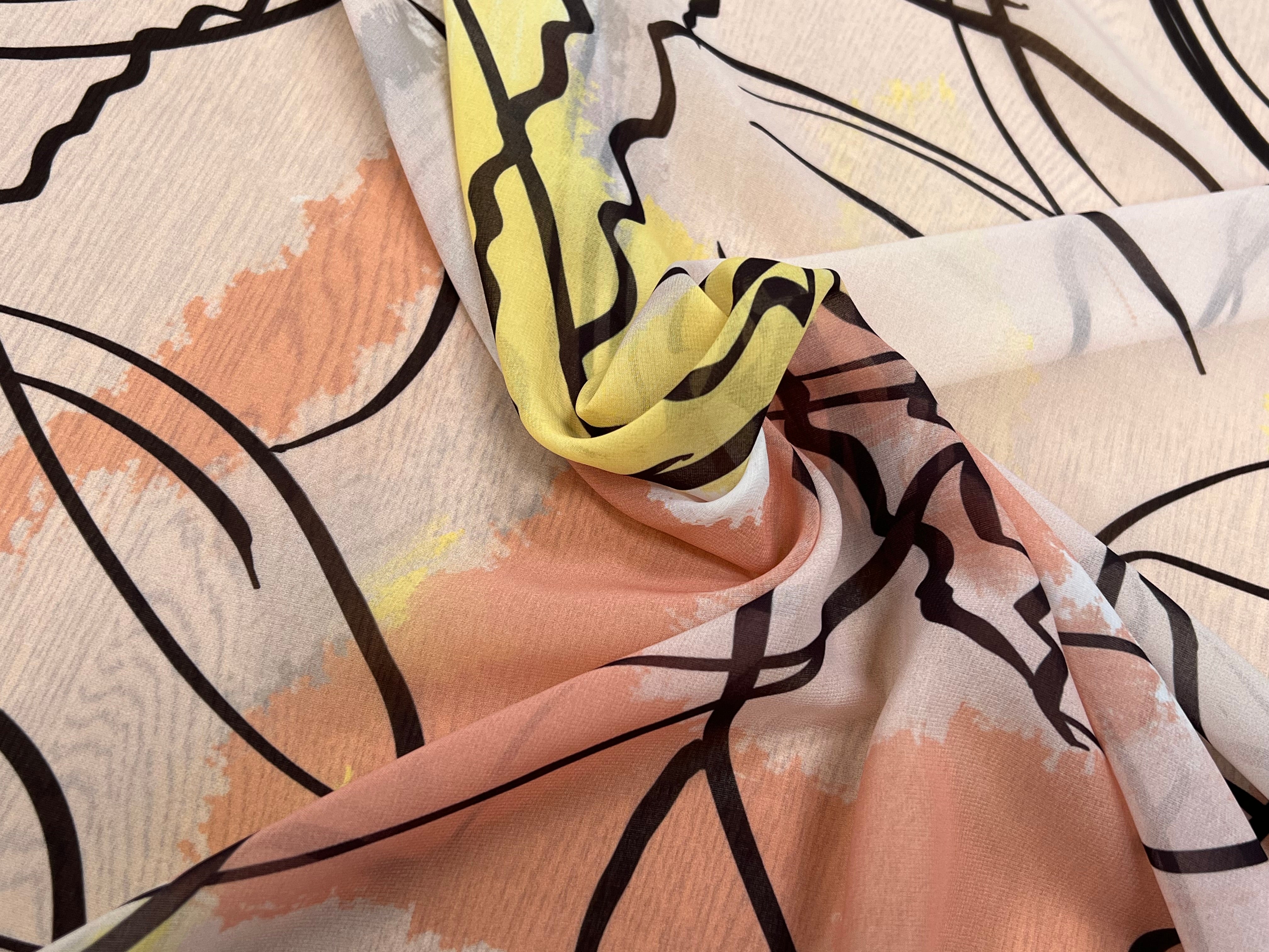 MOUSSELINE JAUNE MARRON MOTIF ABSTRAIT POLYESTER