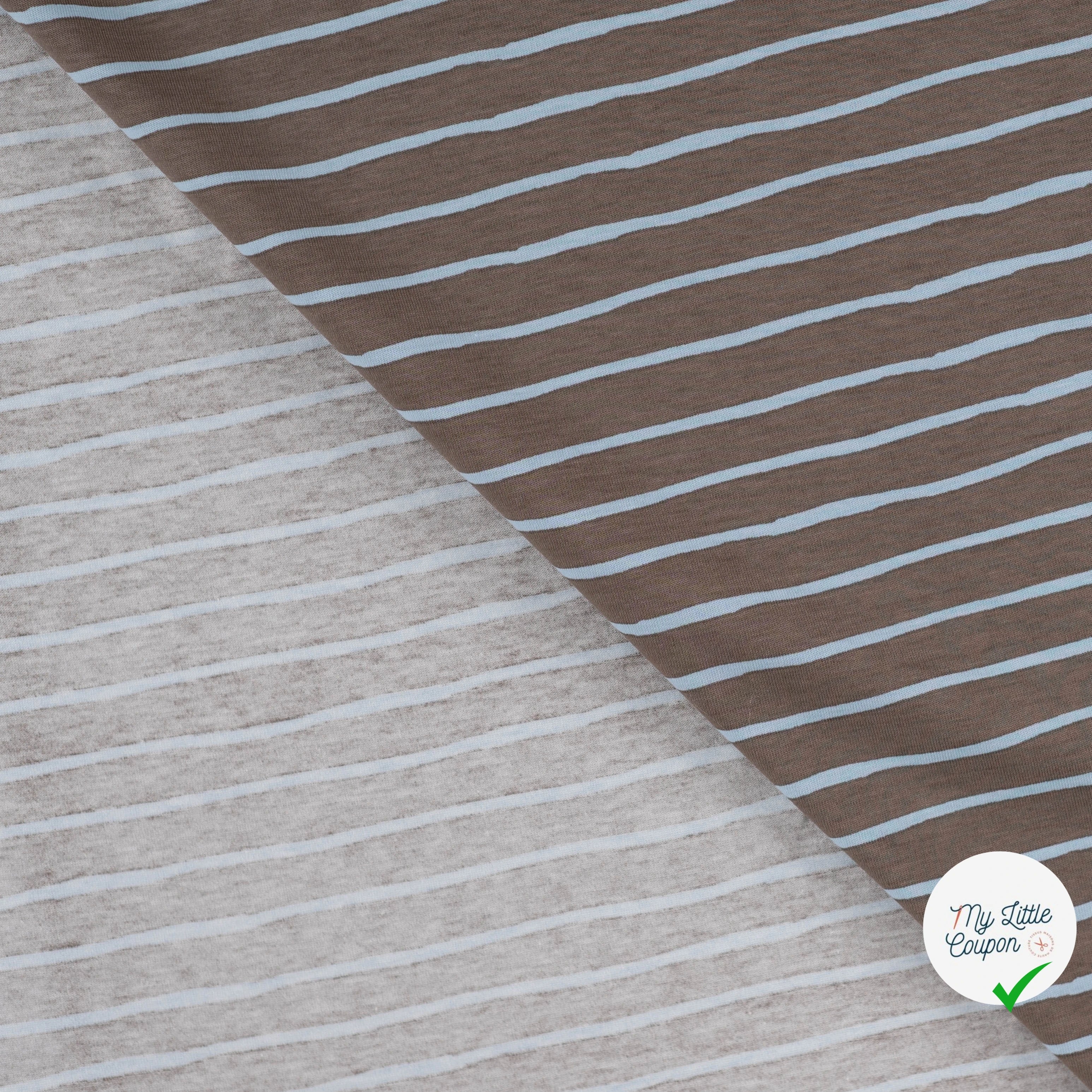 Proposition de création: Idéal pour la confection de tops et t-shirts en jersey coton imprimé rayures fond kaki foncé. Parfait pour des robes ou jupes légères en jersey stretch. Convient également pour des projets couture tels que des housses, accessoires ou pochettes en jersey.