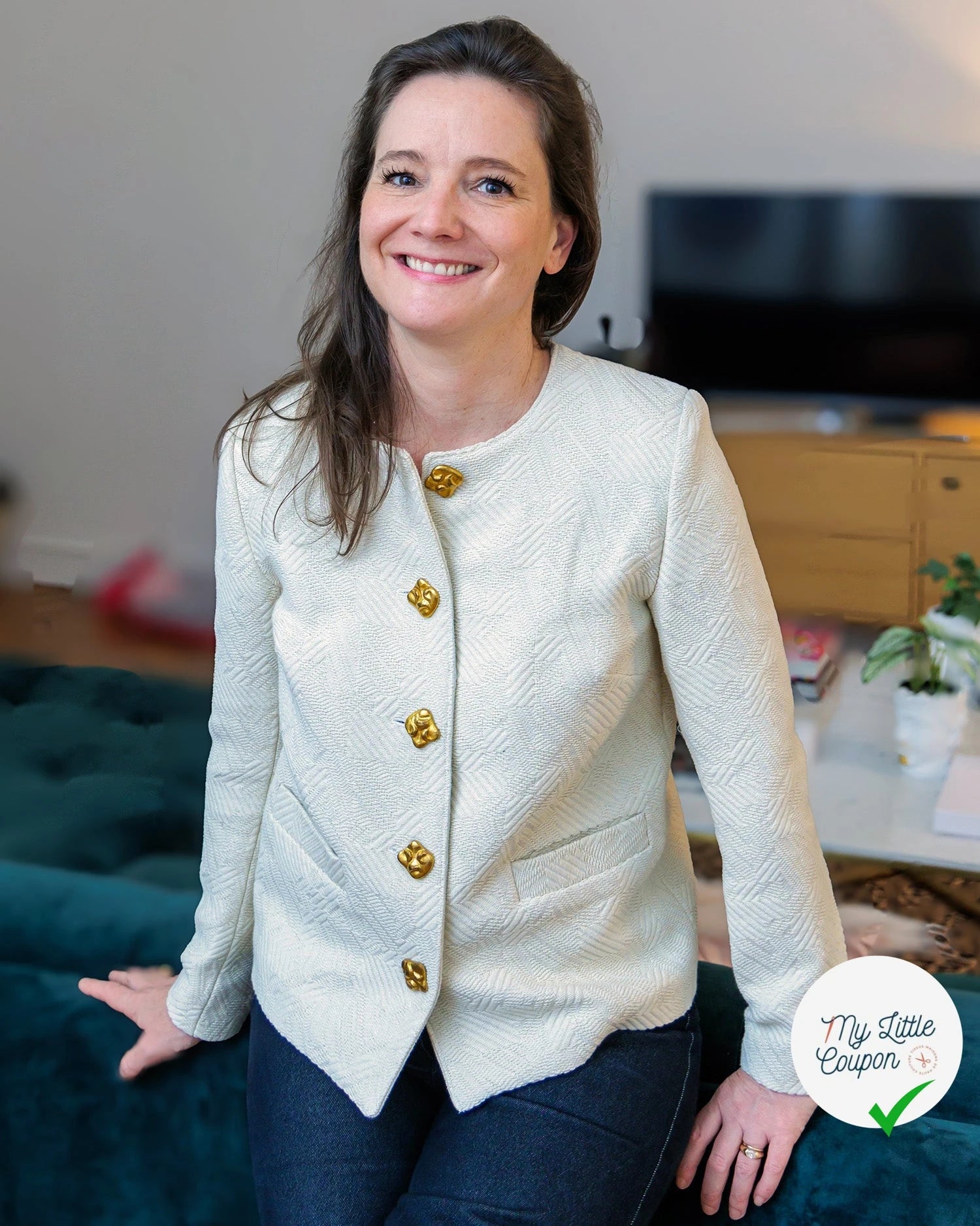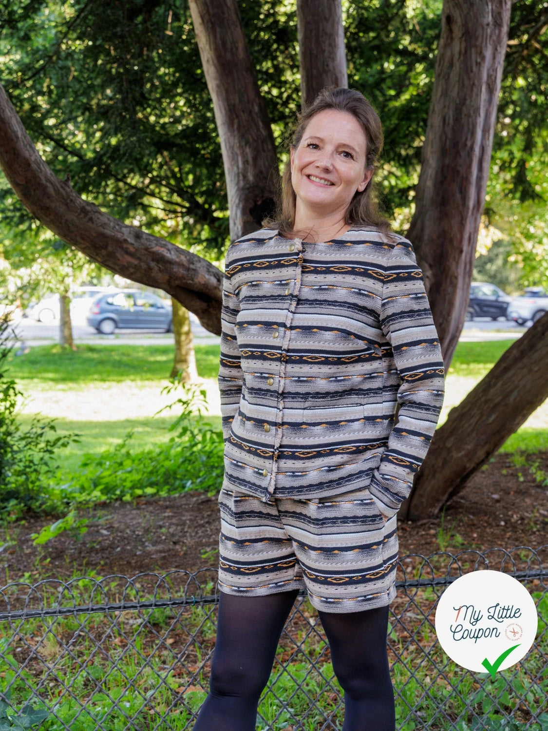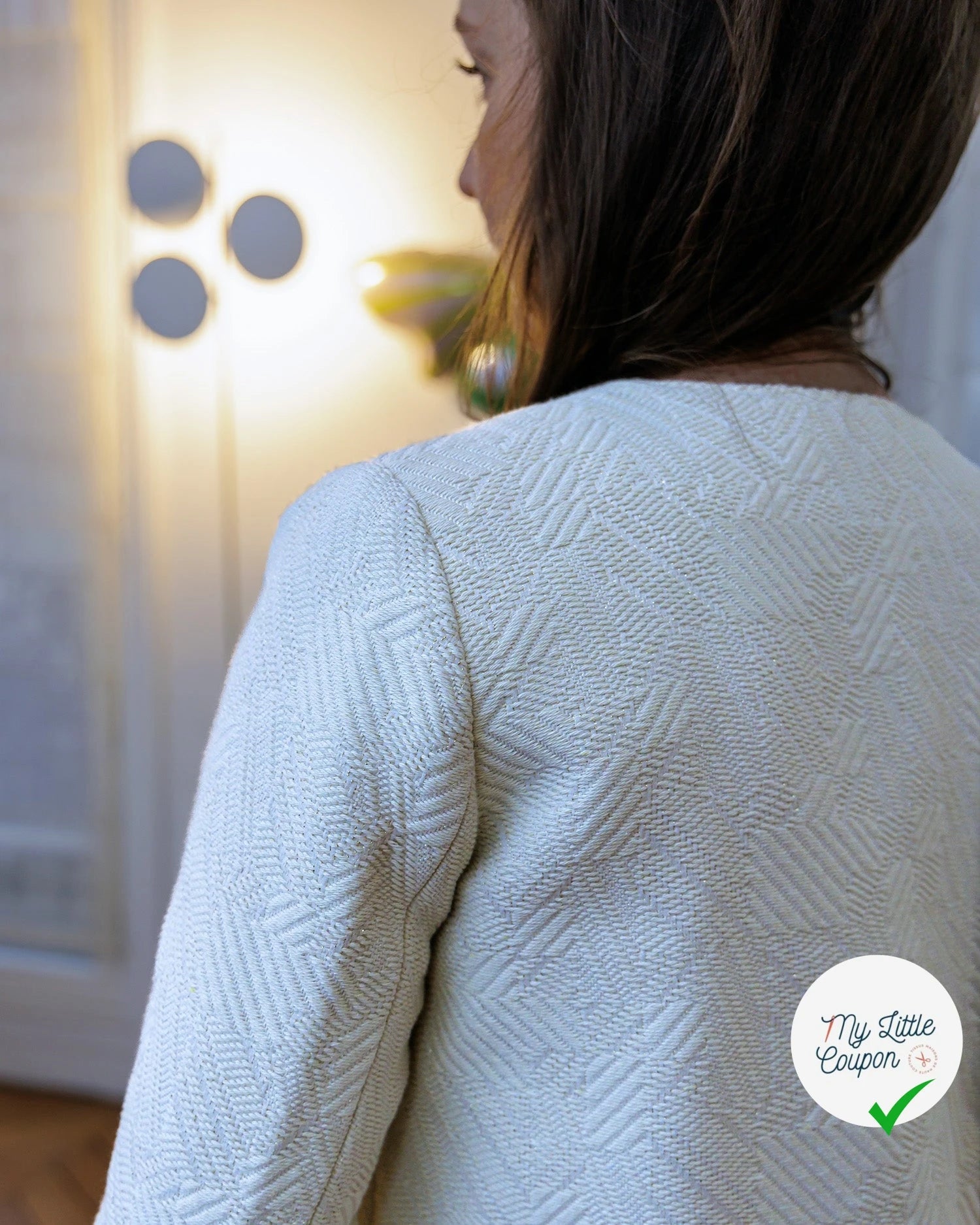 Pour un rendu couture, optez pour des tissus de caractère : tweed, jacquard, laine bouillie, bouclé ou lainage fantaisie. Ces matières apporteront texture, tenue et élégance à votre création. Poids conseillé : 250 à 400 g/m² (7.4–11.8 oz/yd²).