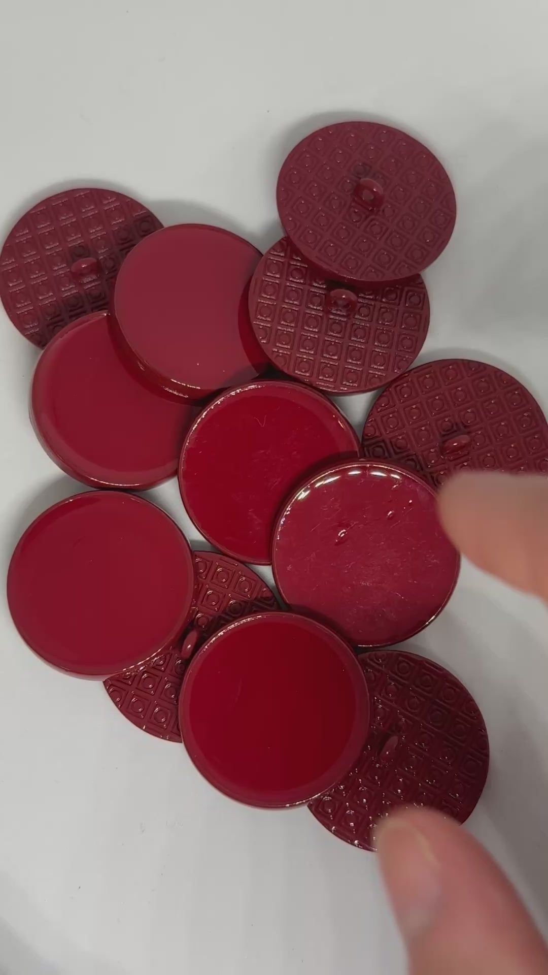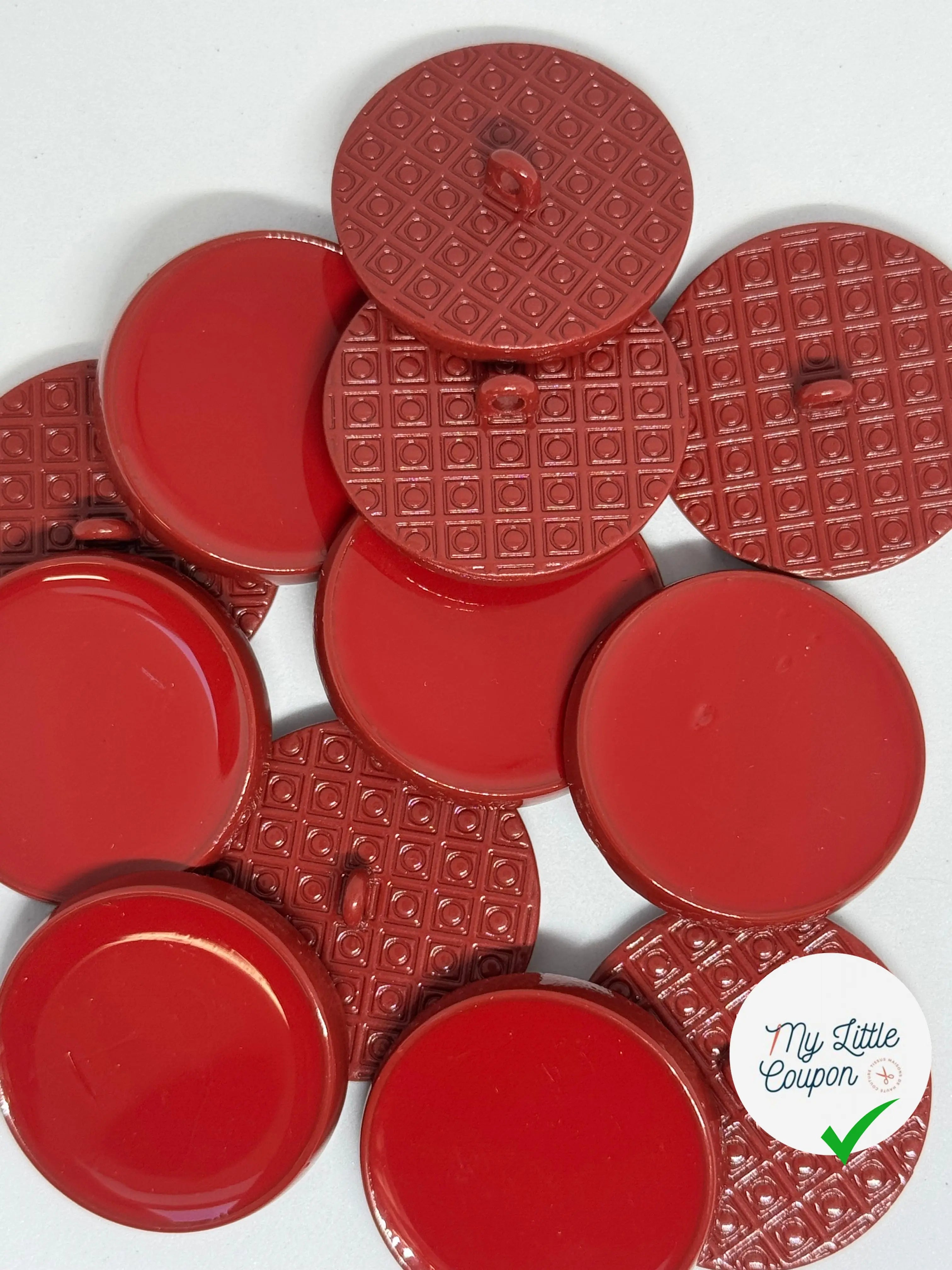 Avec un diamètre de 25 mm et une épaisseur de 4 mm, ce bouton est conçu pour allier style et robustesse. Sa teinte rouge intense, subtilement nuancée de bordeaux, s'harmonise parfaitement avec une variété de tissus et de designs, qu'ils soient modernes ou classiques.