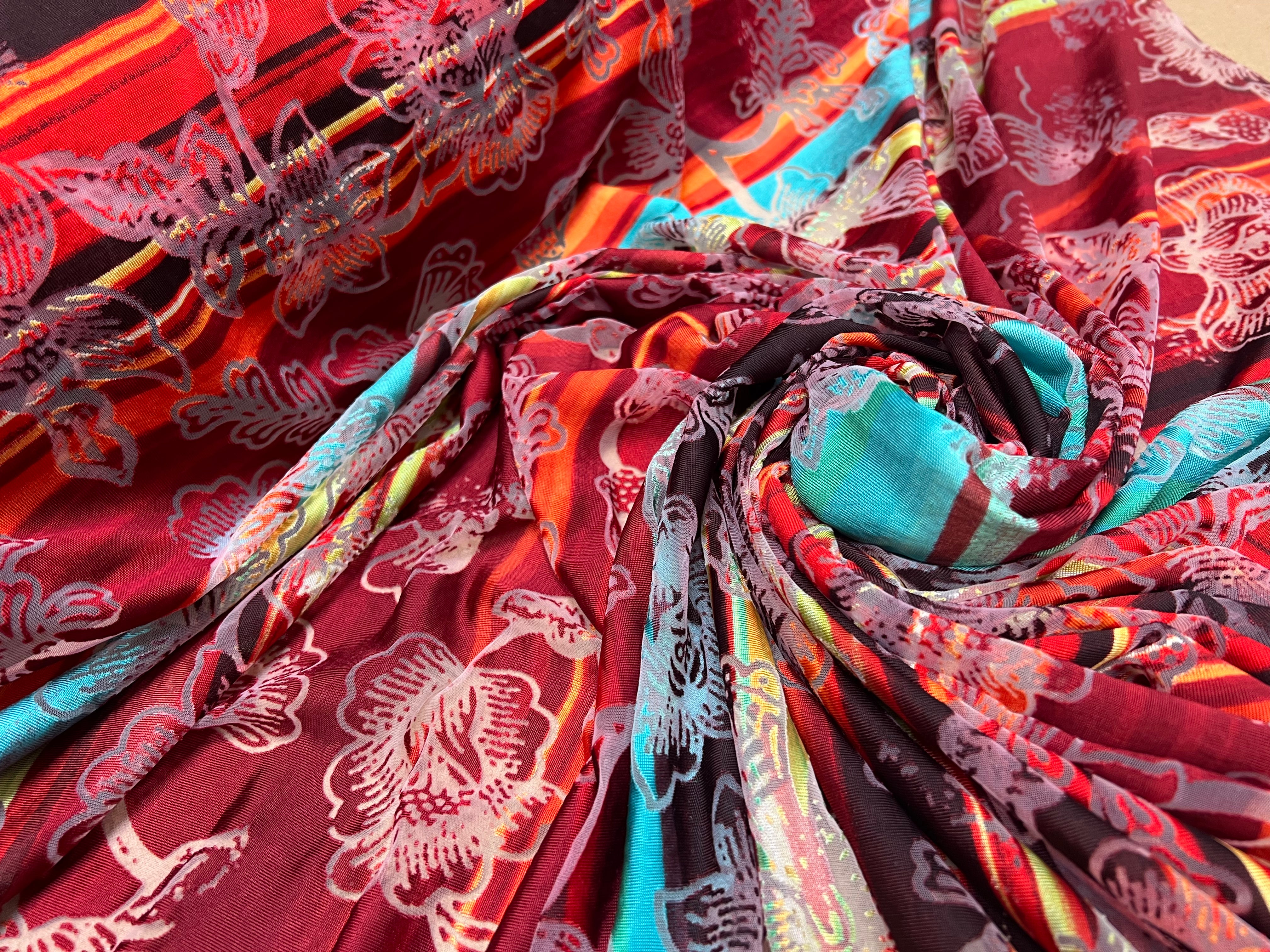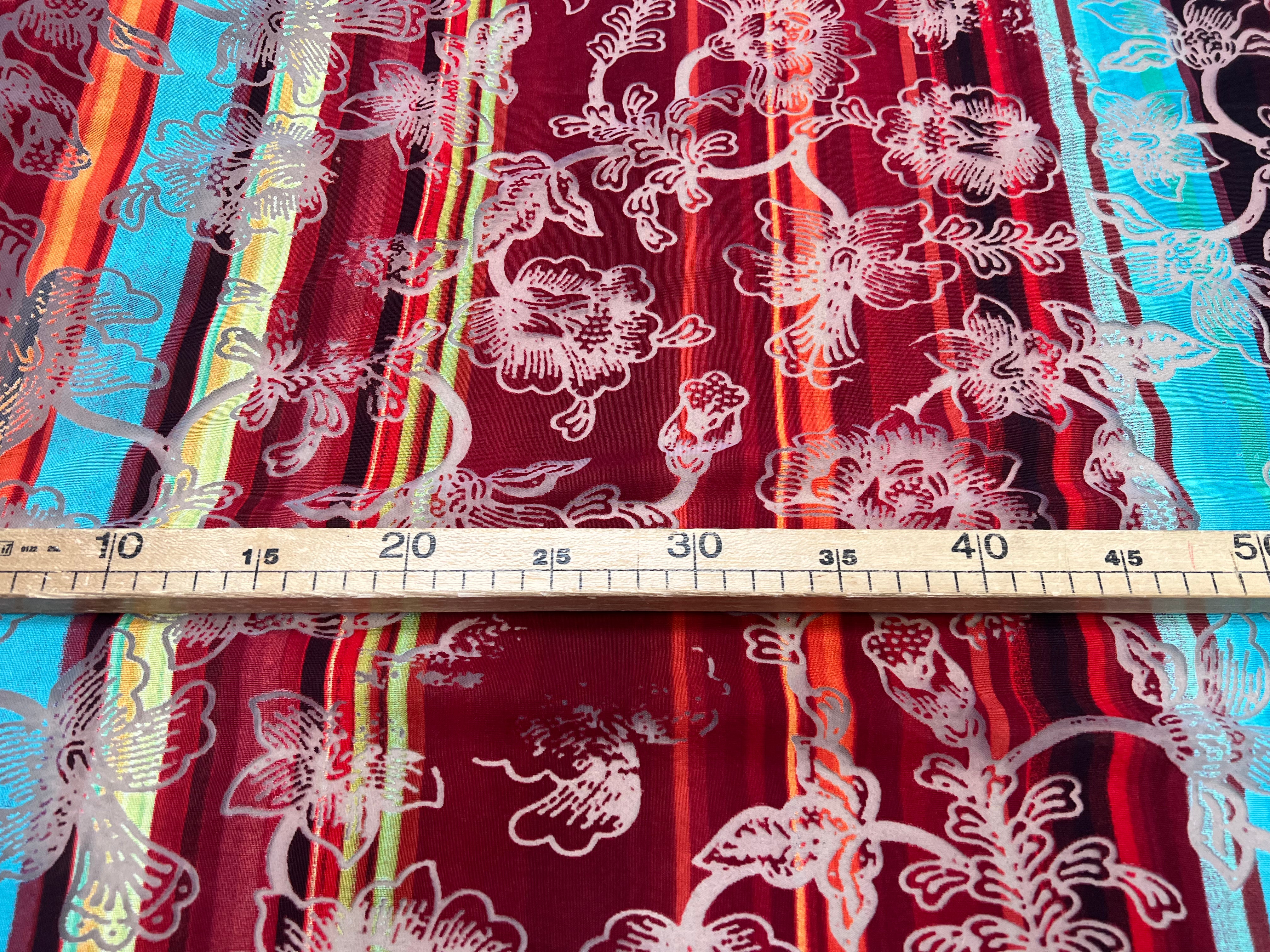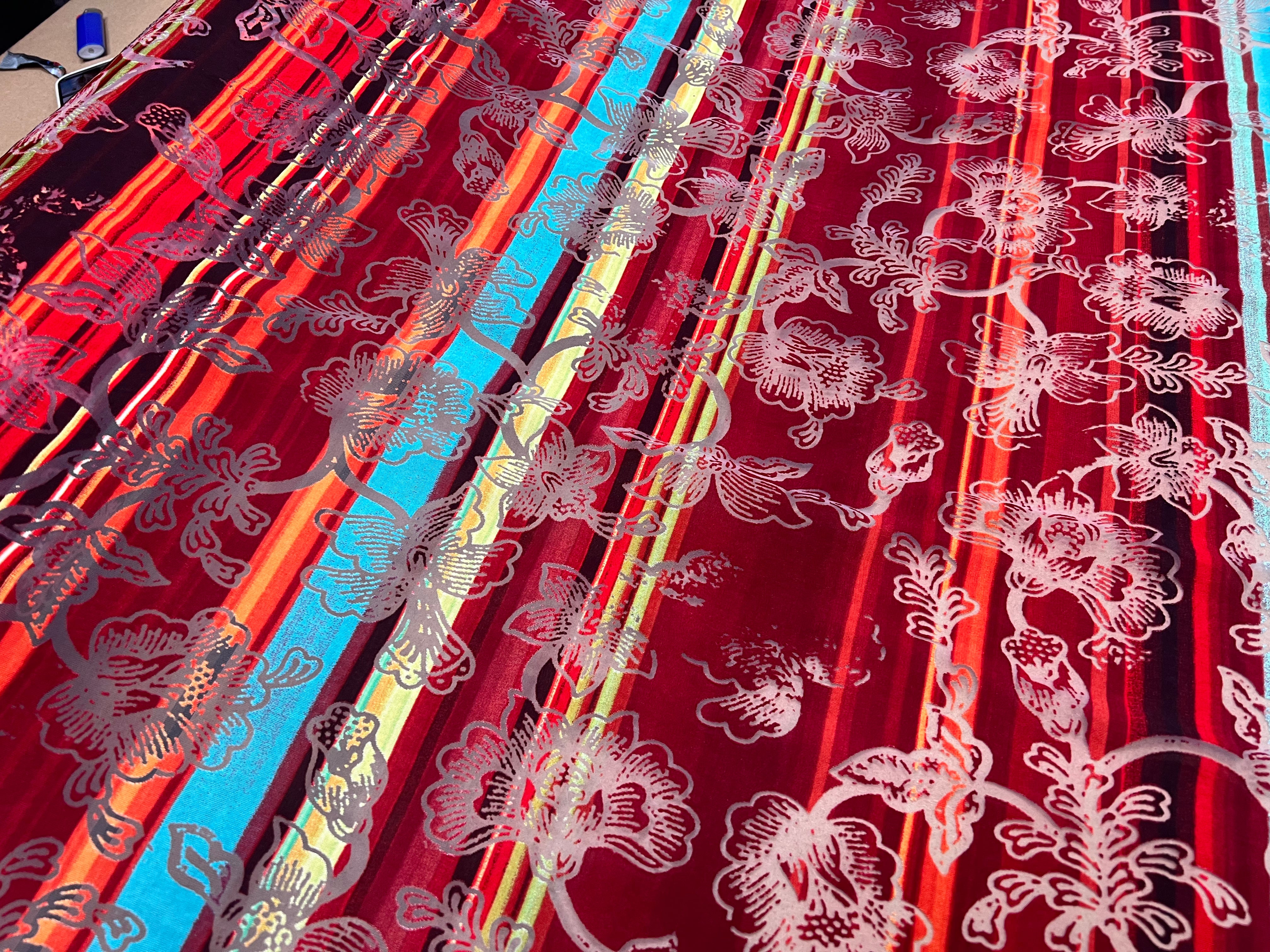MAILLE DEVORÉE DE FLEURS RAYÉE FOND ROUGE