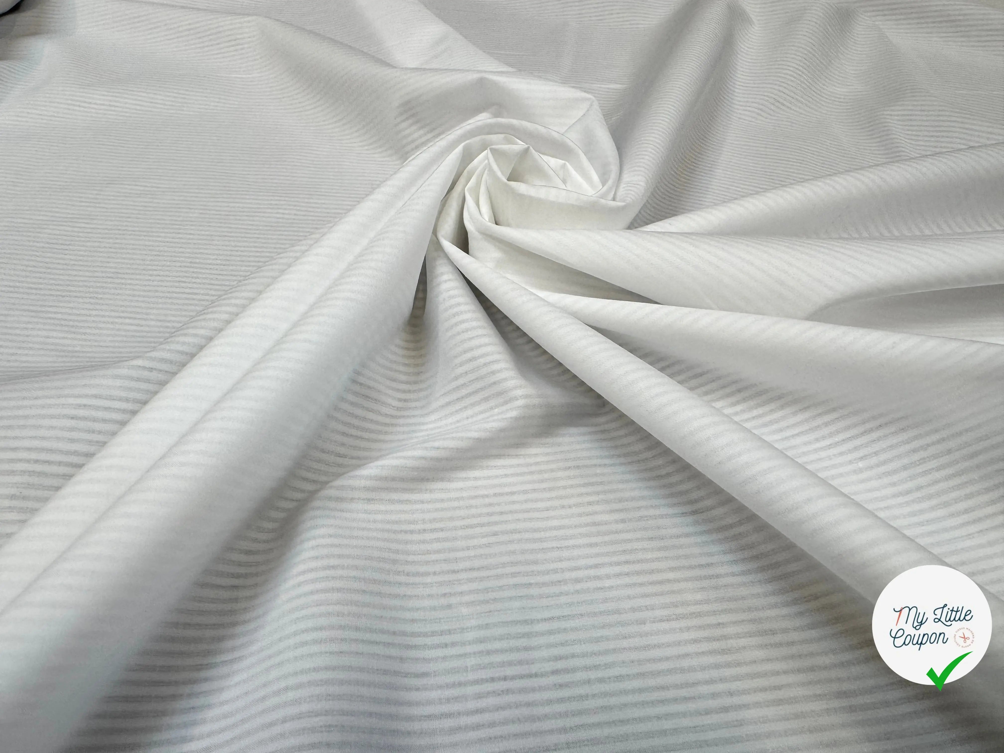 Découvrez notre popeline de coton blanche à rayures régulières effet satiné, un tissu d'exception conçu pour sublimer vos créations couture. Fabriquée en Italie, cette popeline allie élégance et confort, grâce à sa composition en 100% coton.
