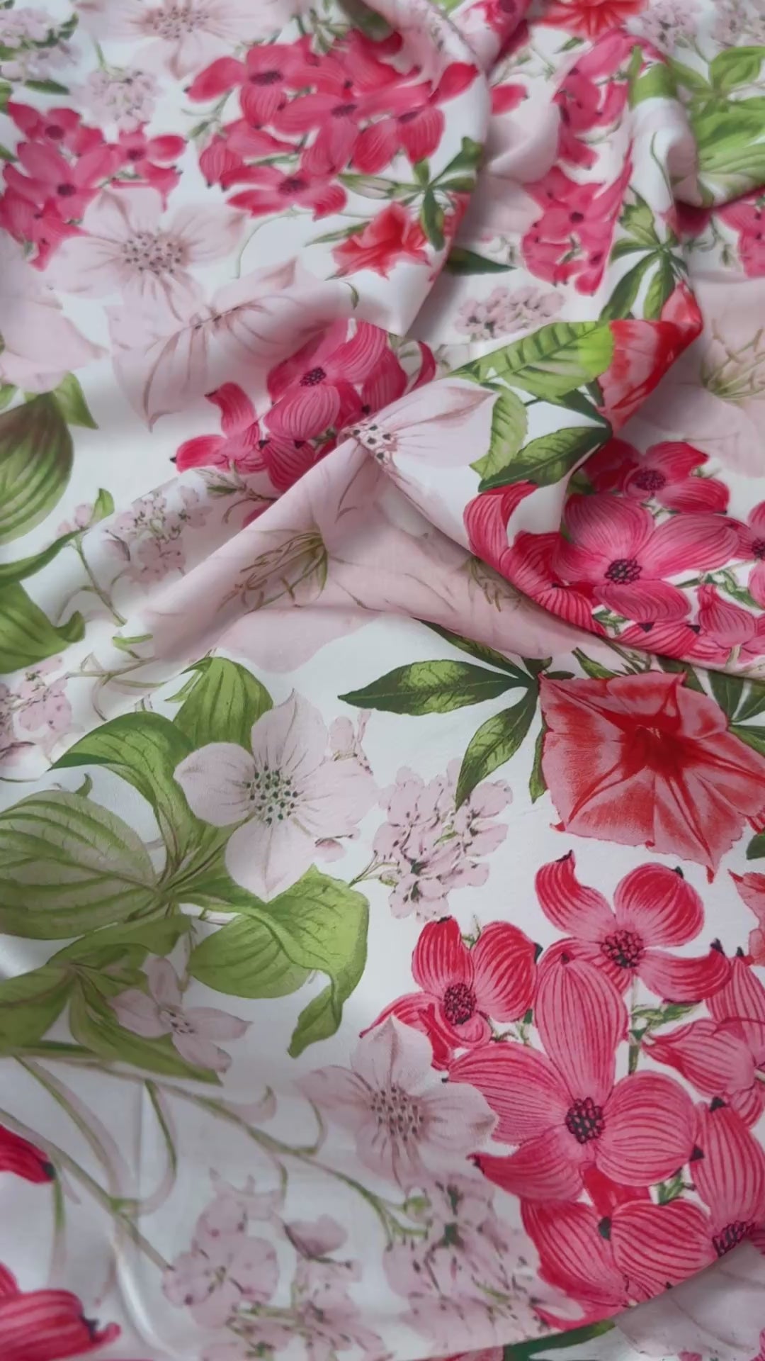 CREPE SATINÉ FOND BLANC MOTIF FLEURS ROSE ET FEUILLES VERTE