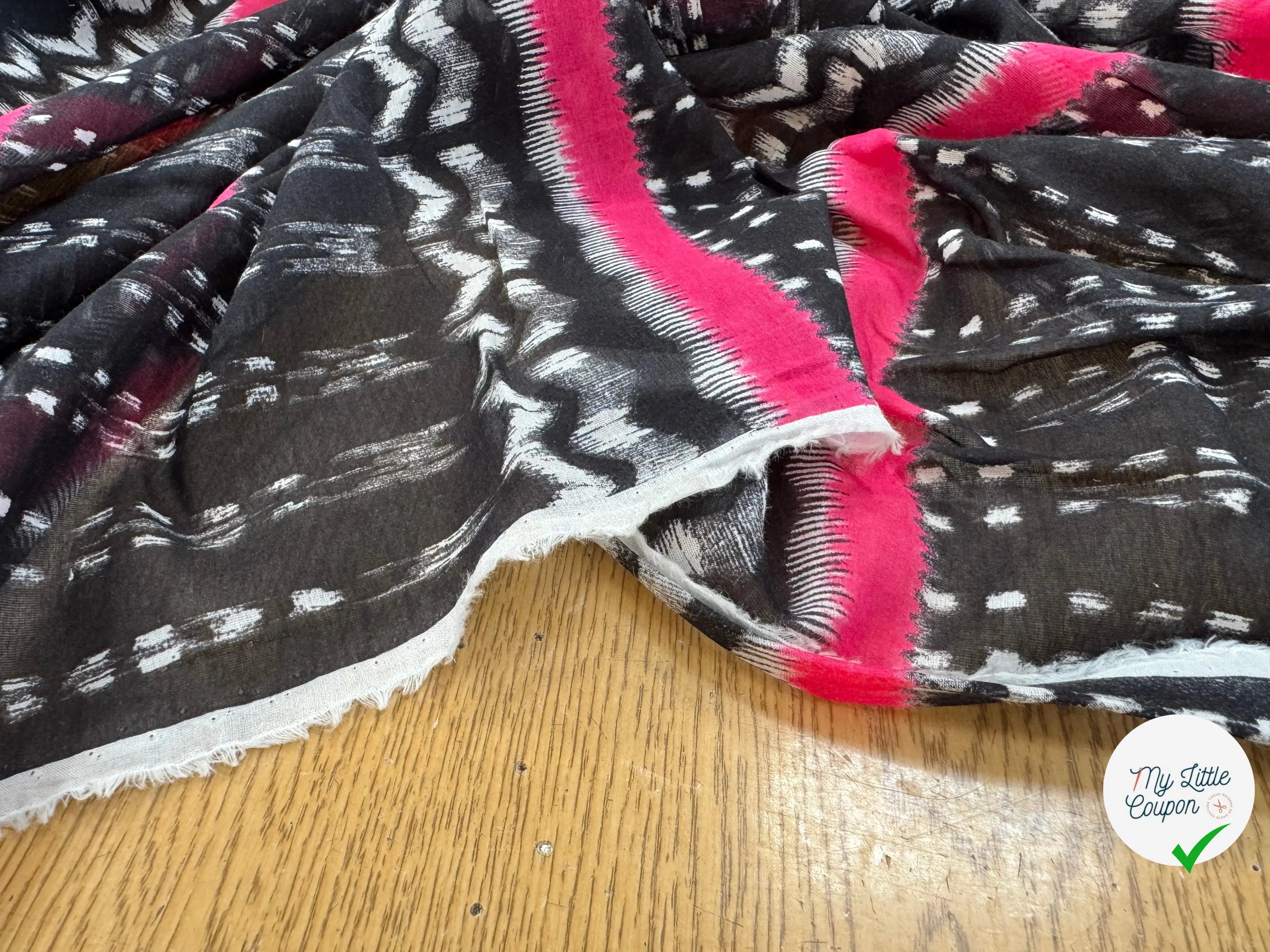 Ce VOILE DE COTON FOND NOIR MOTIFS GÉOMÉTRIQUE ROSE ET BLANC incarne à la fois élégance et légèreté, idéal pour réaliser des créations raffinées et originales. Fabriqué en Italie, ce tissu de haute qualité offre une finition soignée qui saura répondre aux attentes des amateurs de couture exigeants.