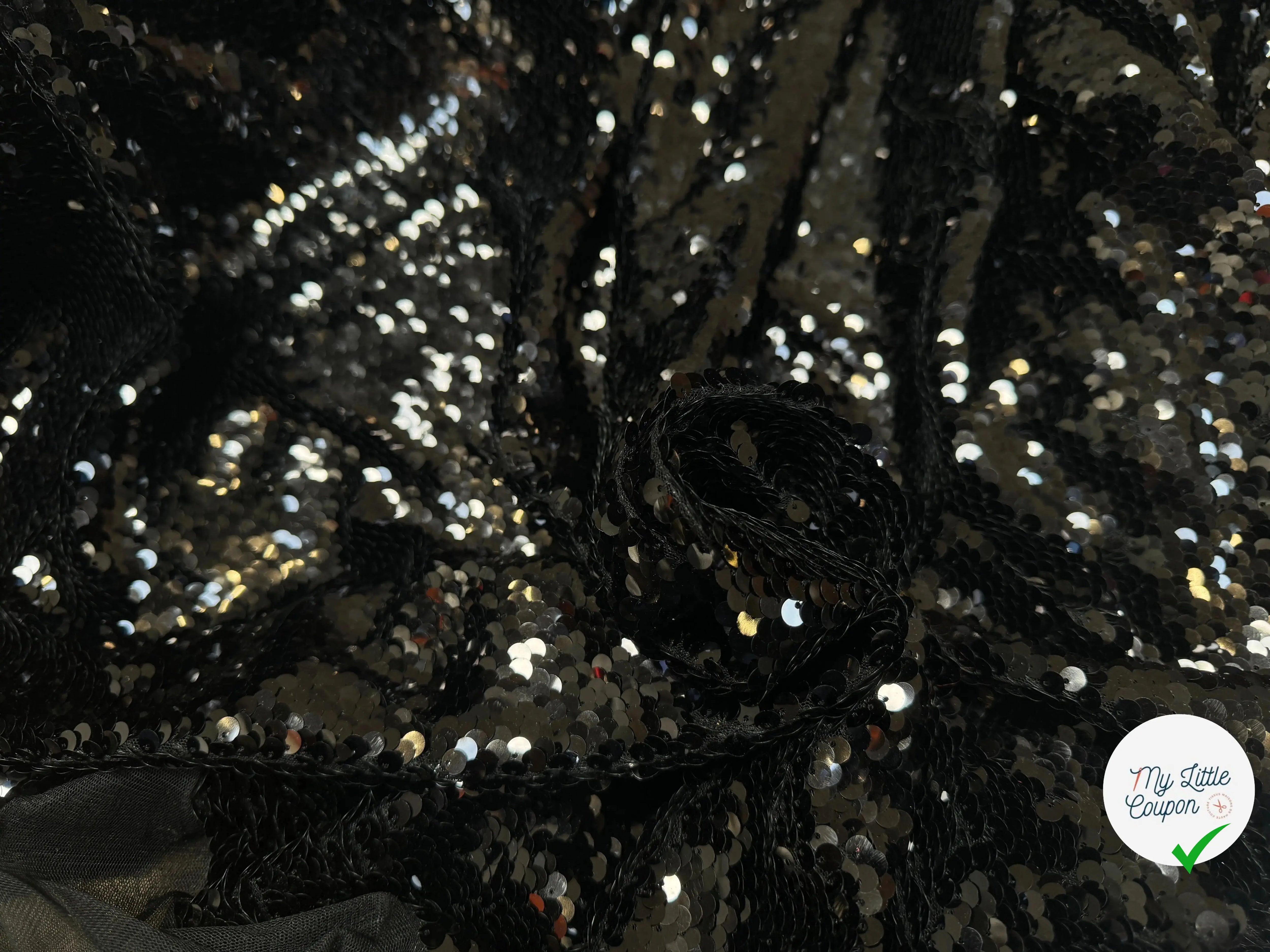 Ce tissu en paillettes sur tulle noir est un textile sublime d'une qualité incroyable, parfait pour des créations sophistiquées et éclatantes. Sa composition garantit un éclat scintillant, une texture légère et une transparence délicate grâce au tulle. La qualité de fabrication coréenne assure une durabilité et une finesse remarquables, en faisant un choix idéal pour des vêtements ou des accessoires festifs.