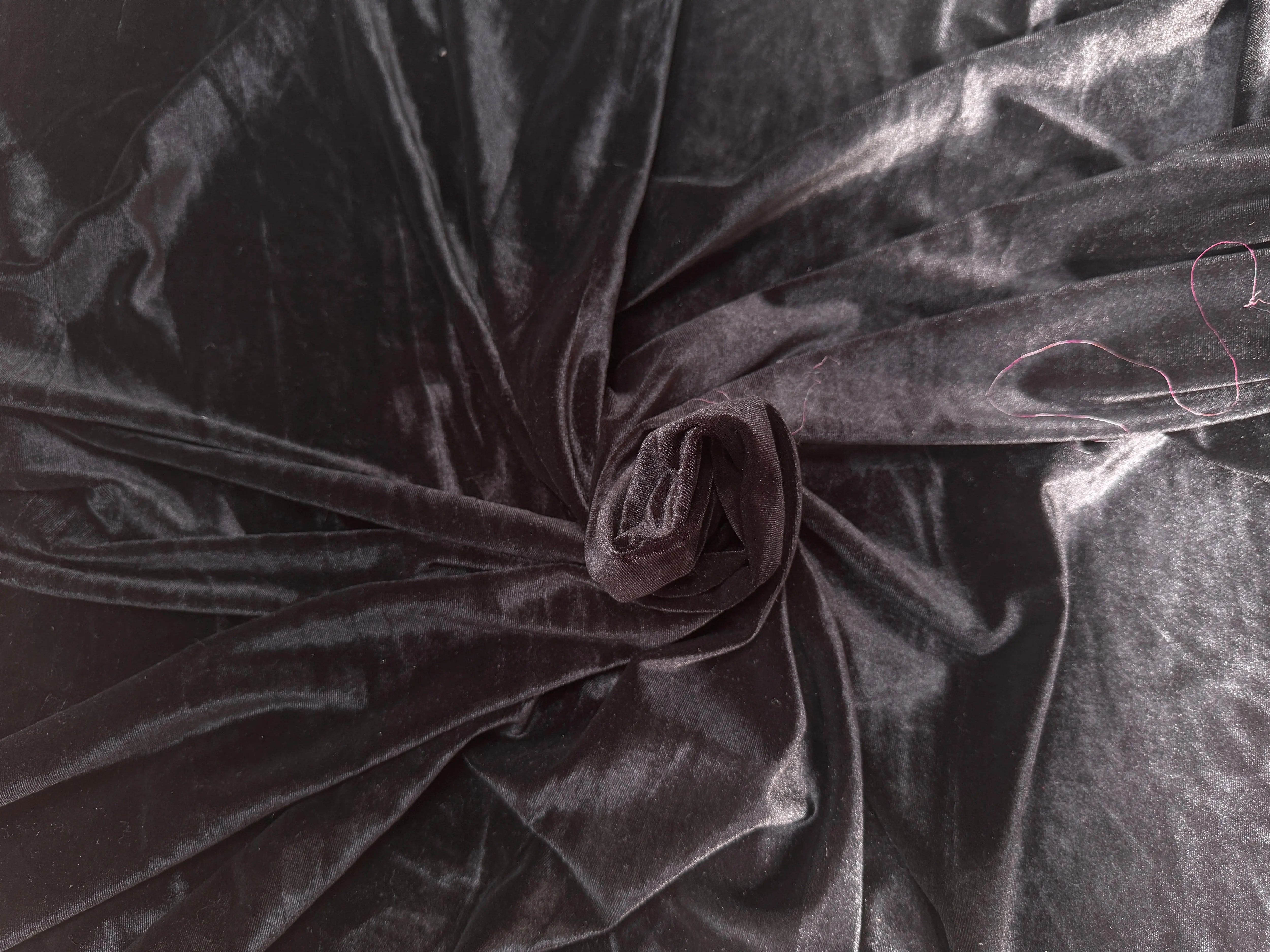 Plongez dans le luxe avec notre Velours Velvet Noir 8%EA, un tissu d'exception provenant d'une fabrication italienne de haute qualité. Ce velours, composé majoritairement de polyester avec une touche d'élasthanne, offre une texture douce et somptueuse, idéale pour des créations qui exigent élégance et confort. Grâce à sa composition, ce tissu présente une légère extensibilité, assurant un drapé parfait et une belle tenue.