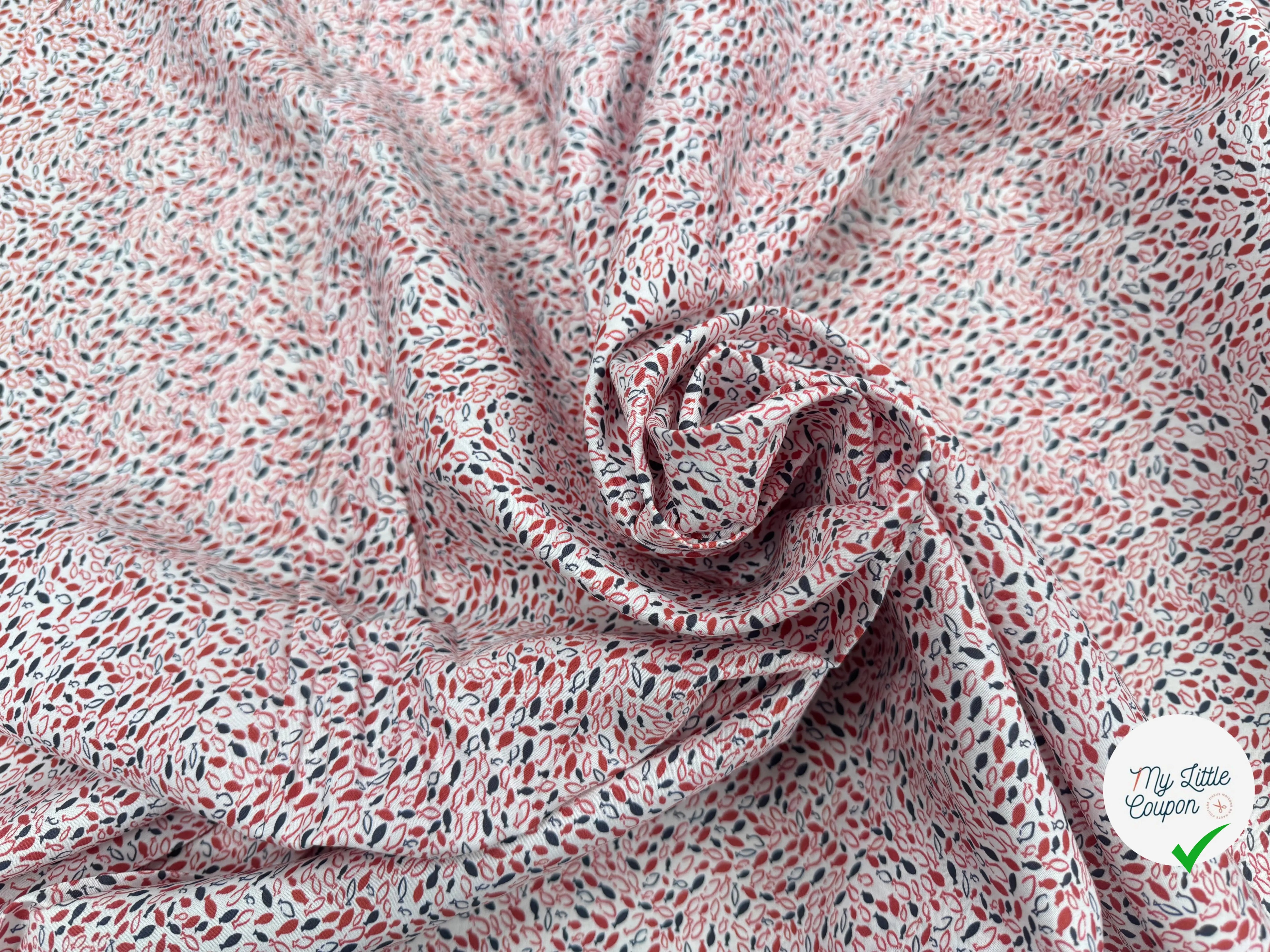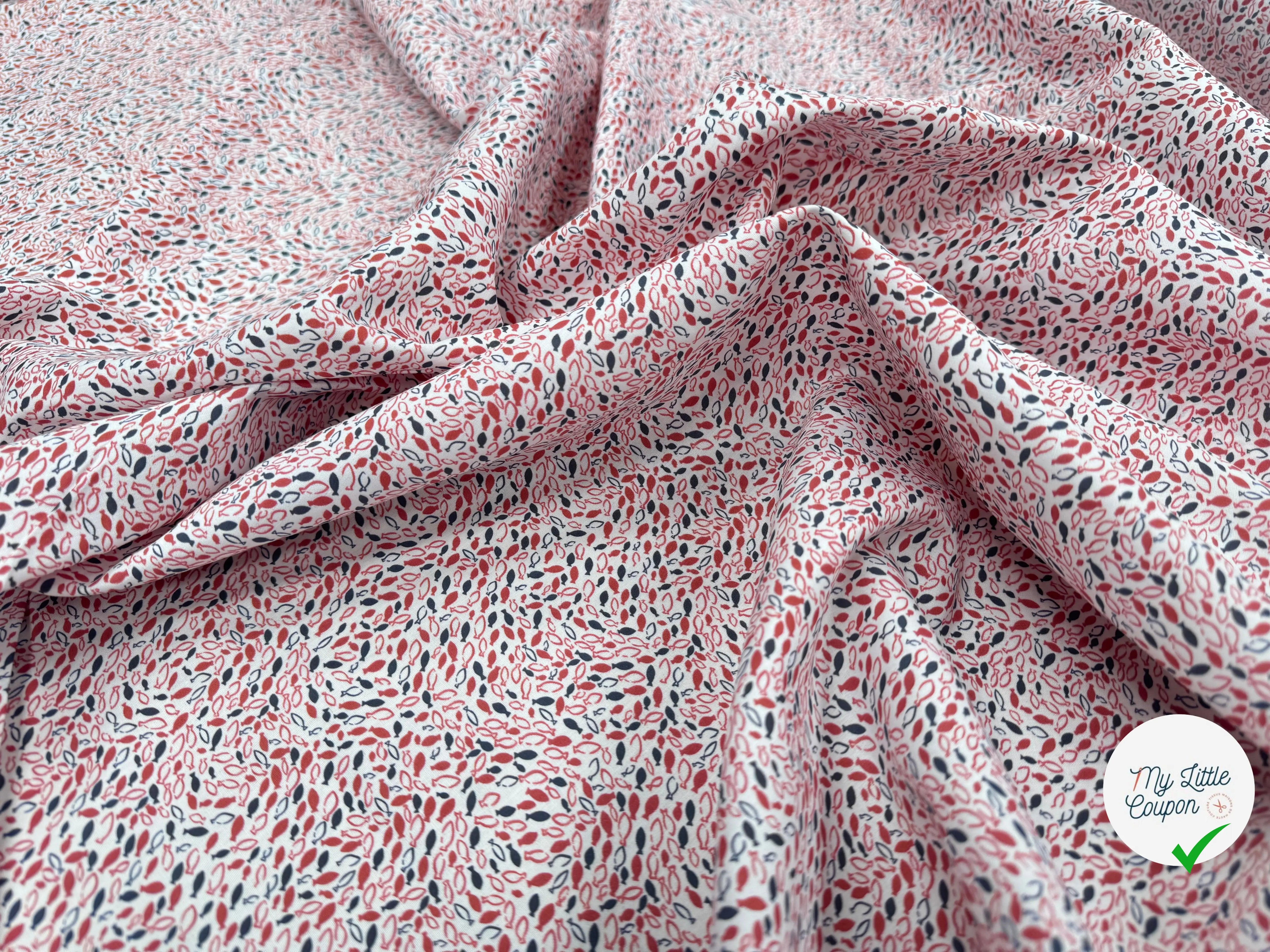 Dieses Baumwolle Muster mit kleinen Fischen italienischer Herkunft vereint Eleganz und Sanftheit und bietet eine angenehme Textur für all Ihre textile Kreationen. Mit einer breite von 145 cm ermöglicht dieses stoff die Realisierung vielfältiger Projekte, während es Ihren Schnittbereich optimiert.