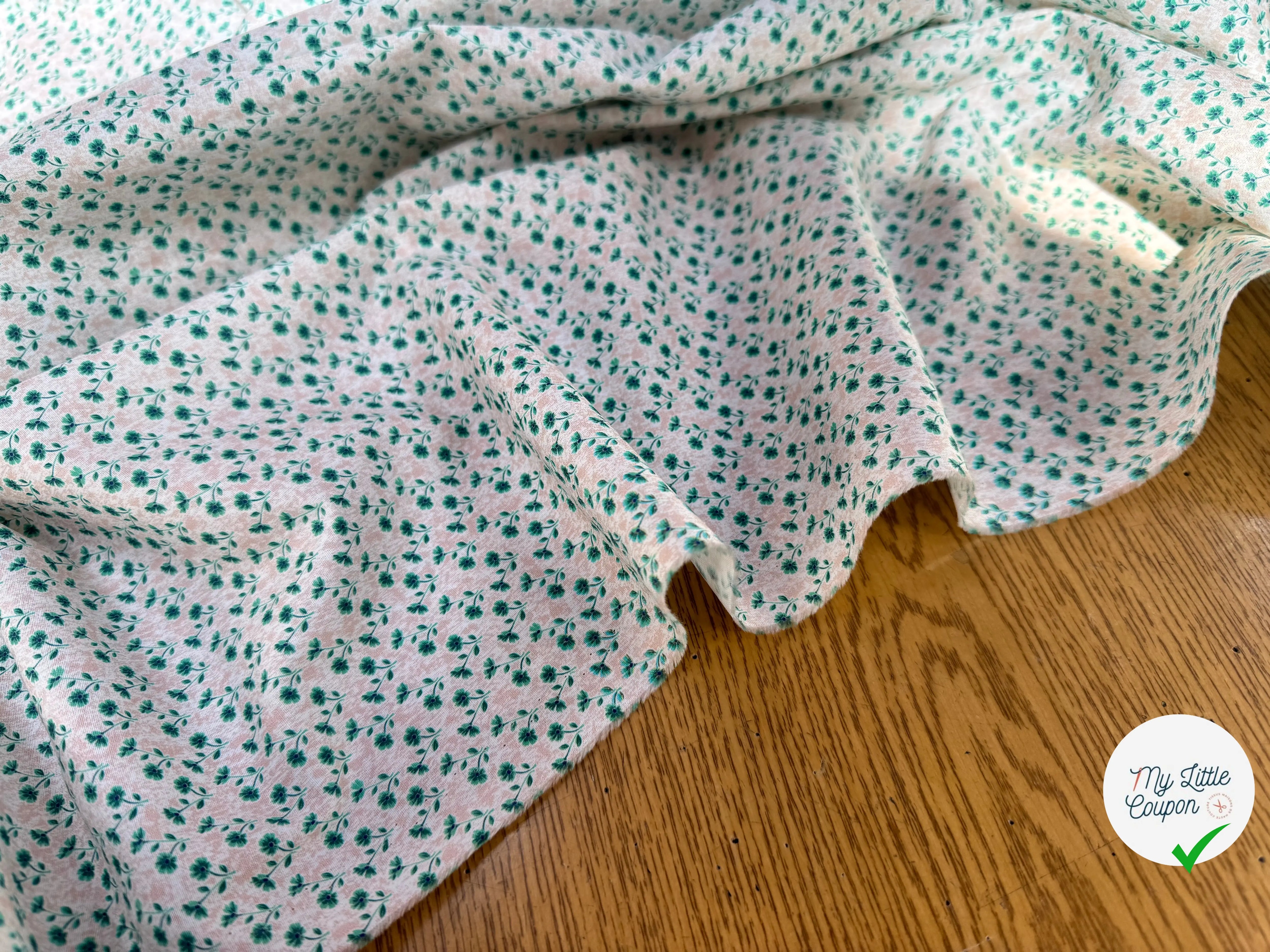 Die Muster von kleinen grünen Blumen auf einem blassen rosa Hintergrund bieten eine frische und romantische Ästhetik. Dieses stoff eignet sich auch perfekt zur Herstellung von Wohnaccessoires wie Kissen oder Tischdecken und bringt einen zarten floralen Akzent in Ihr Zuhause.