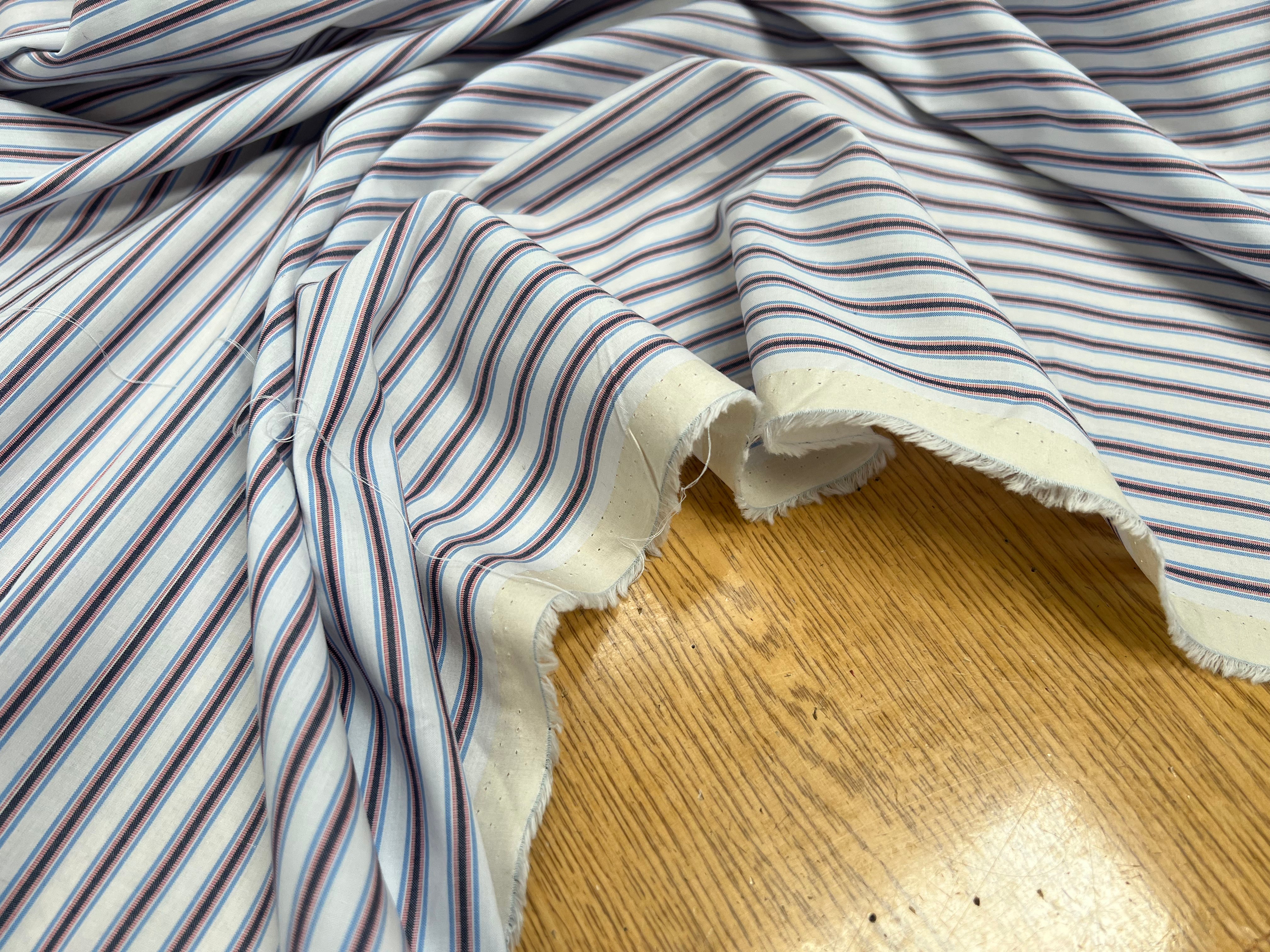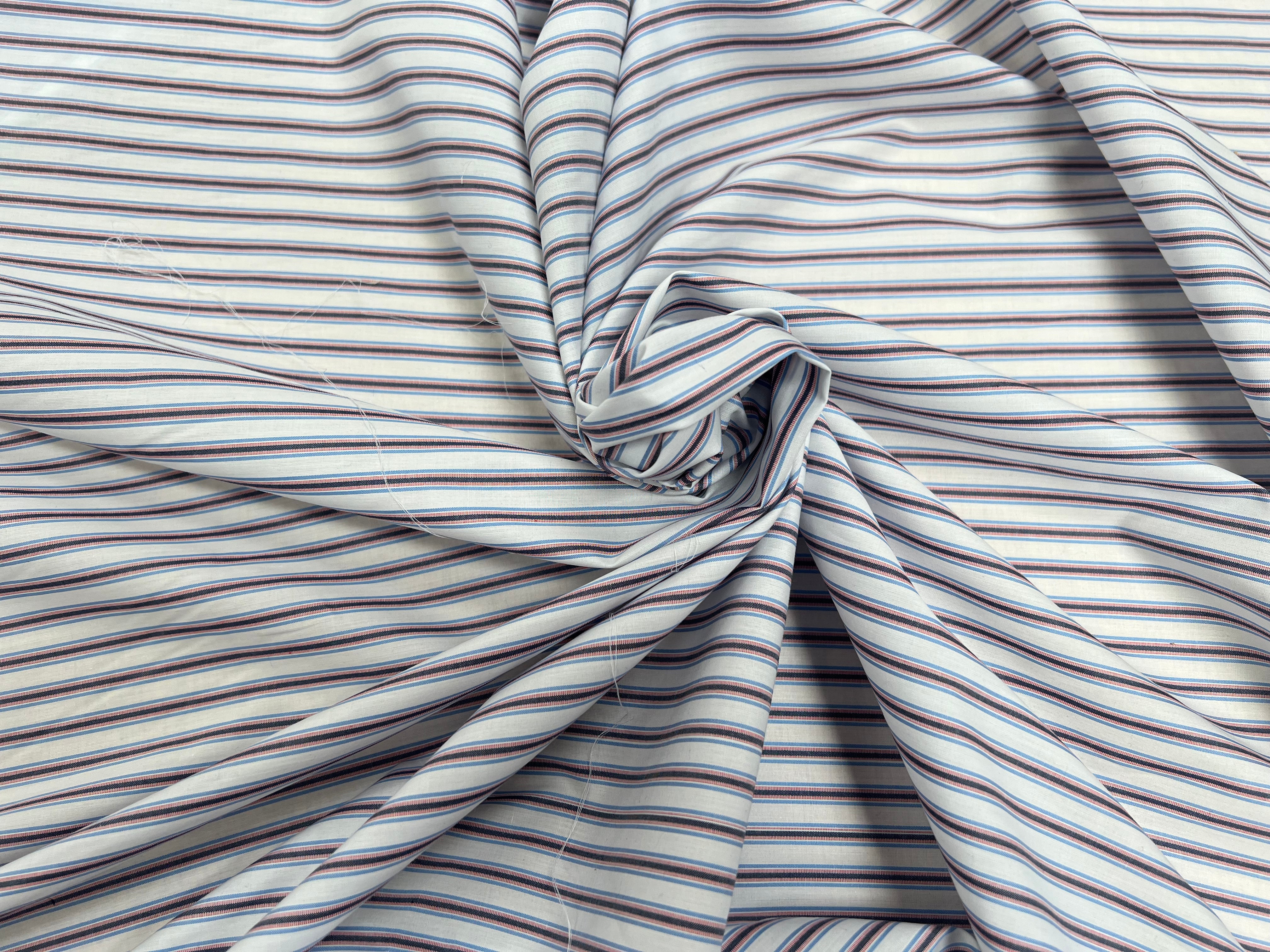Entdecken Sie unser popeline aus Baumwolle weiß gestreift schwarz, blau und rot, ein stoff raffiniertes Produkt, das Eleganz und Praktikabilität vereint. Hergestellt in Italien, bietet dieses stoff von höchster Qualität eine breite von 150 cm und eine Gewicht von 150 g/ml - 100 g/m², die eine schöne Fluidität bietet und gleichzeitig robust genug für Ihre Nähprojekte bleibt.