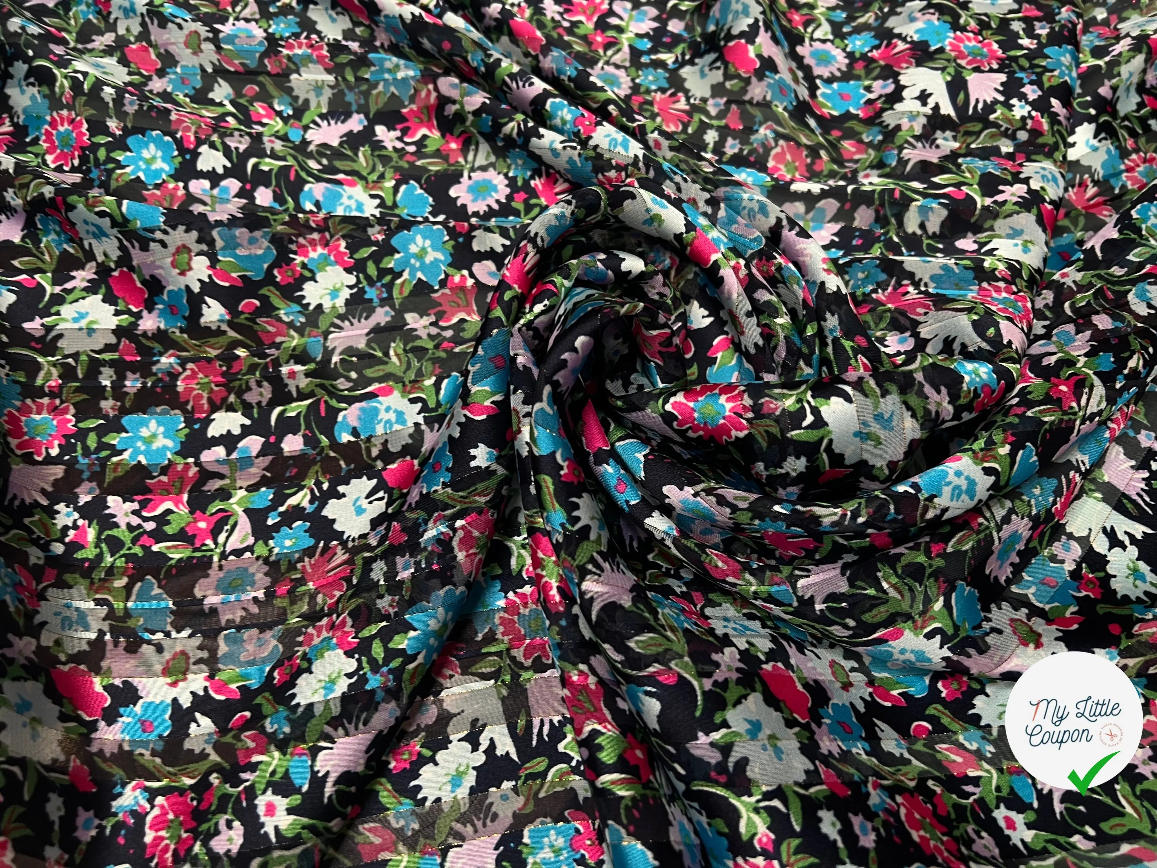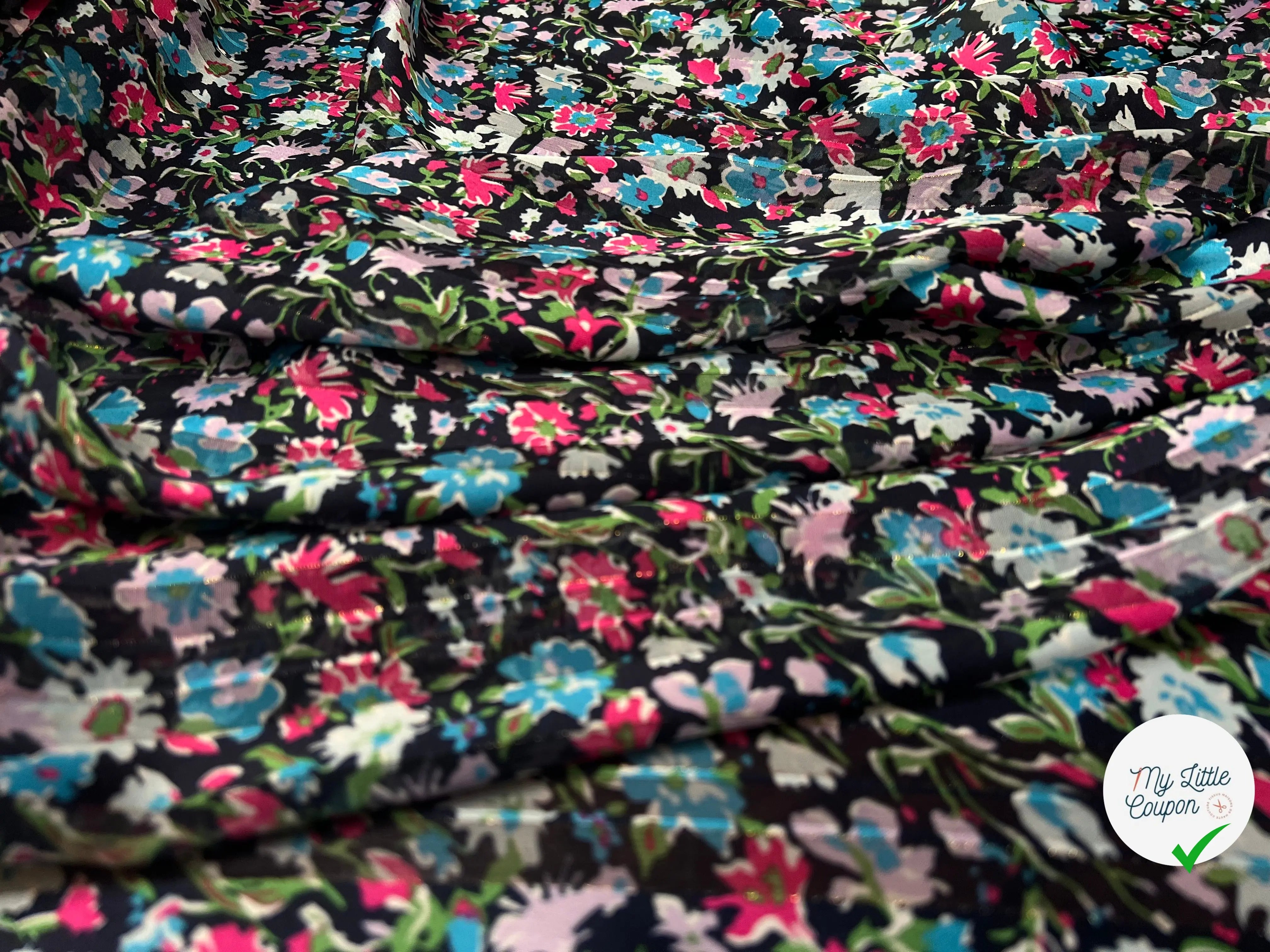 Made of polyester with gold lurex threads, it is perfect for dresses, blouses, lingerie, scarves and accessories. Light and transparent, it is comfortable to wear.