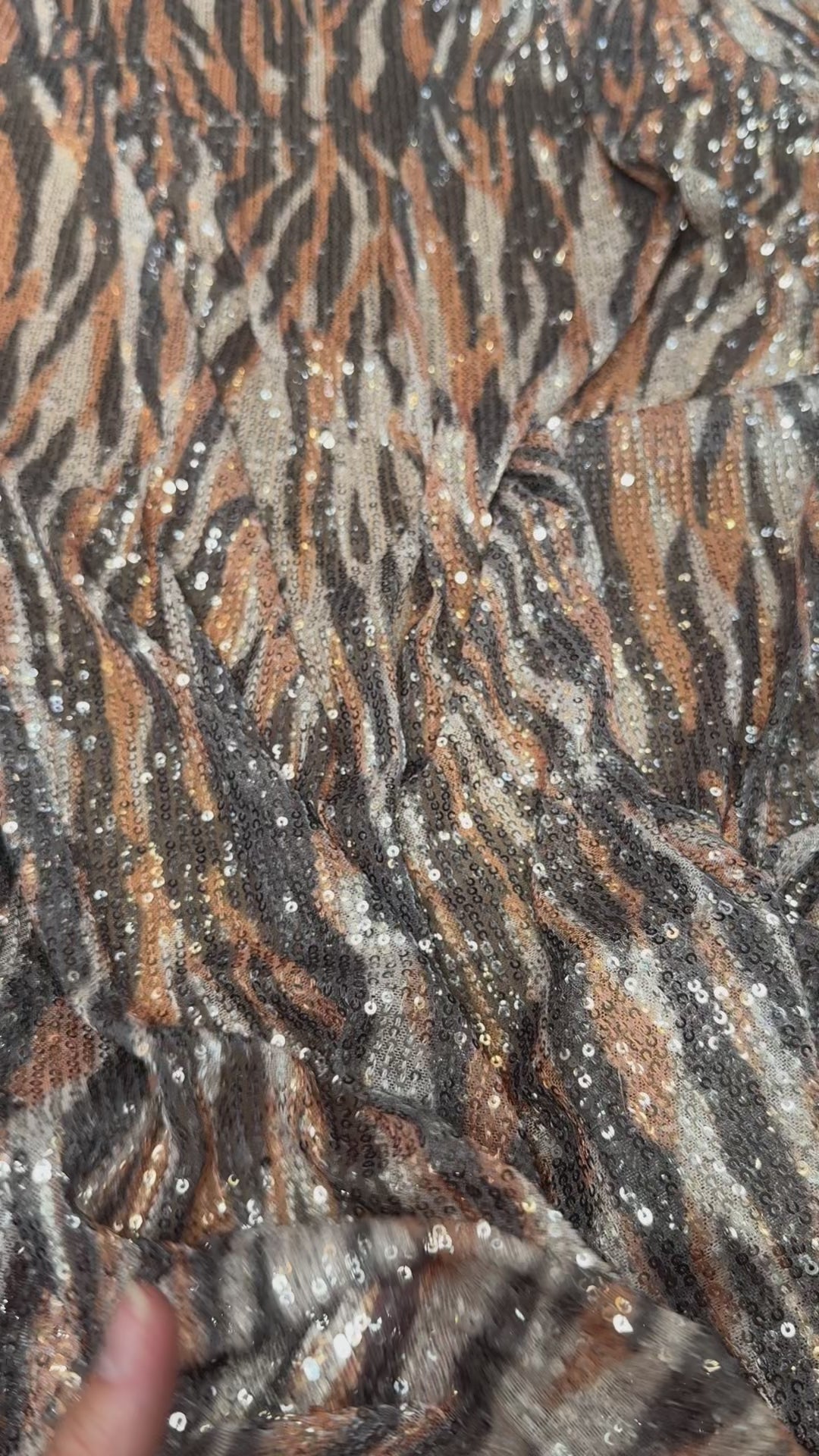 Discover our sumptuous fabric TIGER SEQUIN PATTERNS, an exquisite Italian creation that combines elegance and originality. With a width of 146 cm, this fabric is ideal for creating unique and trendy pieces. Its composition of 95% polyester and 5% elastane gives it great flexibility and optimal comfort, while maintaining a shiny appearance thanks to its multicolored sequin patterns.