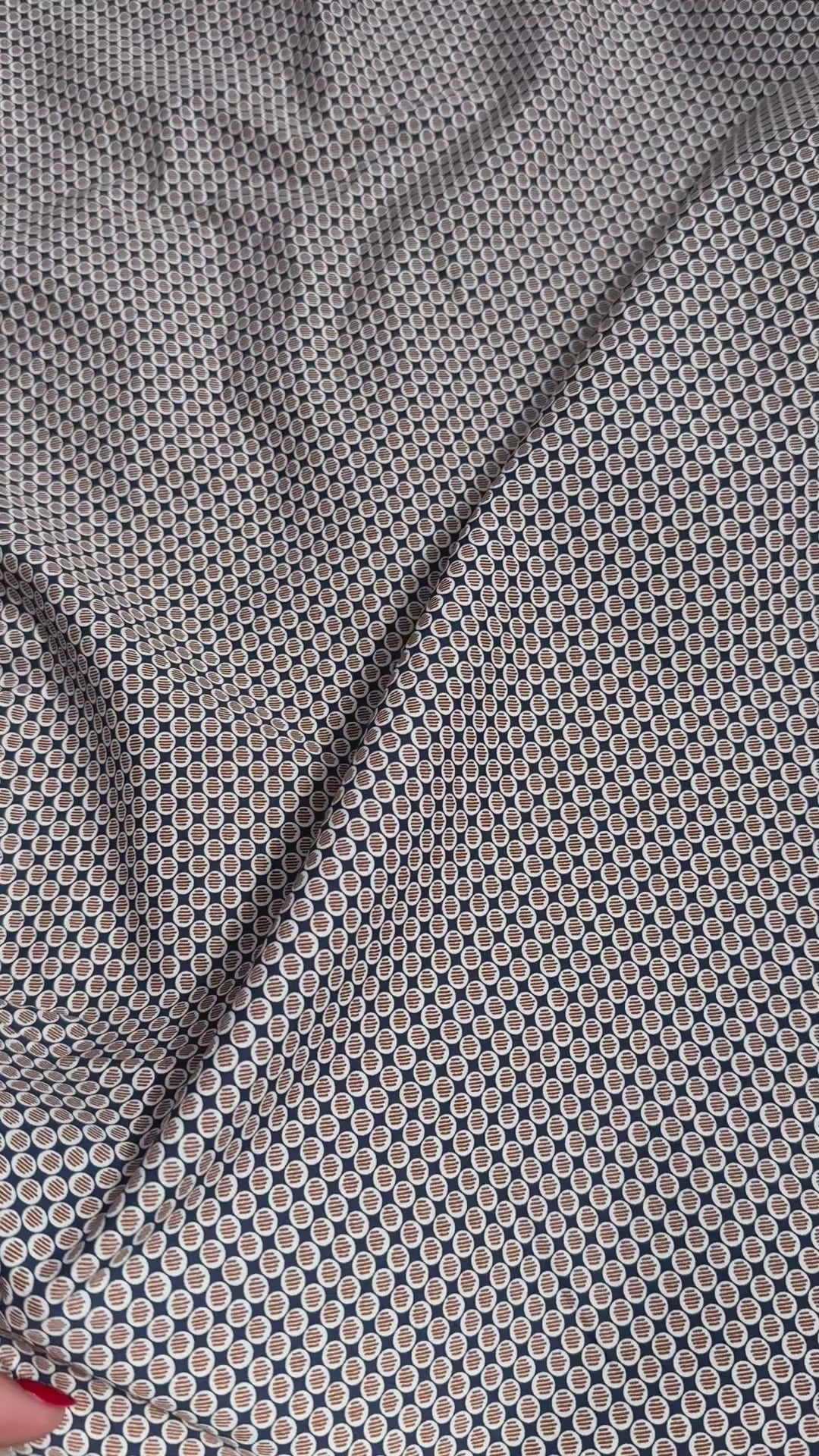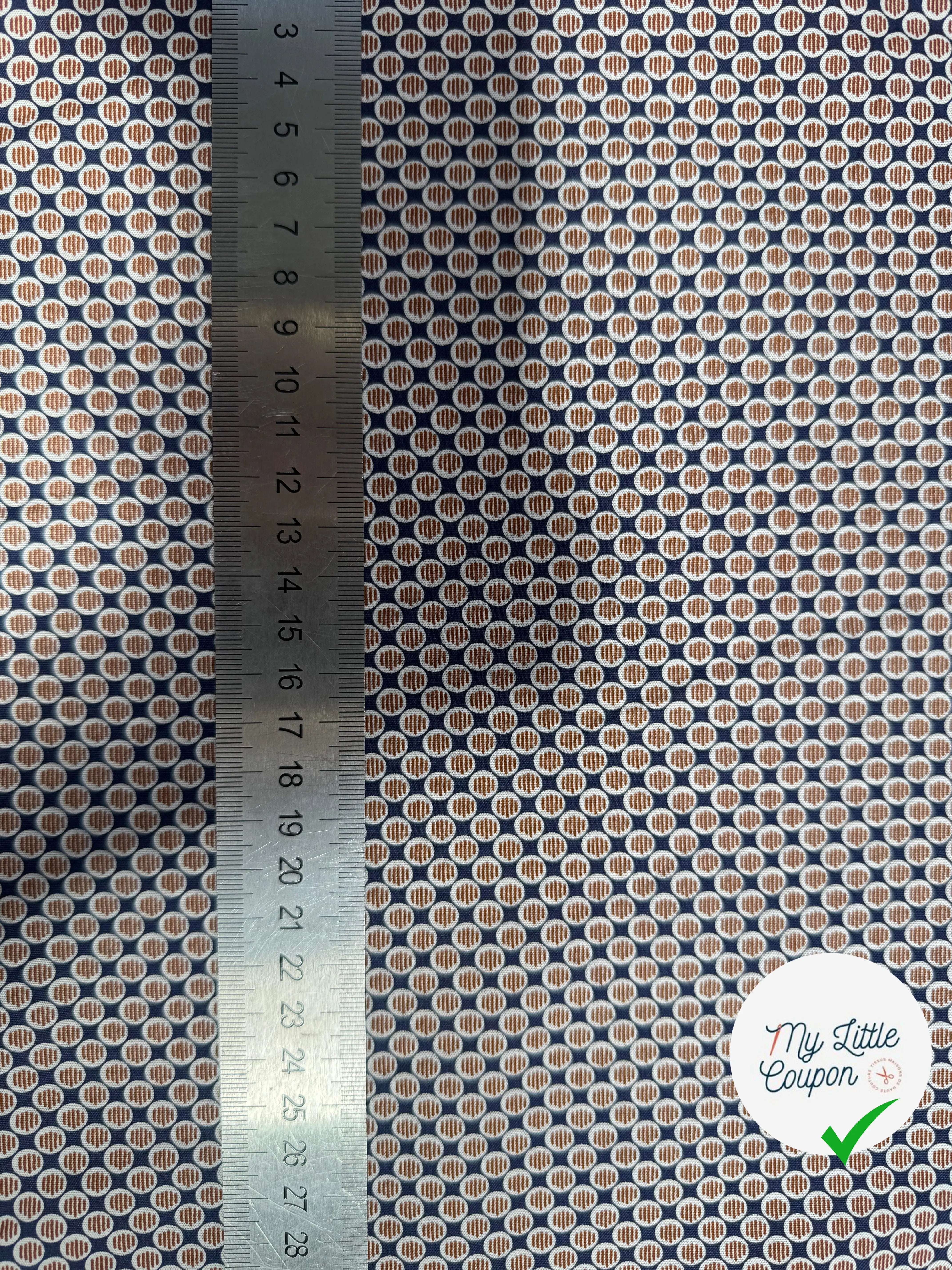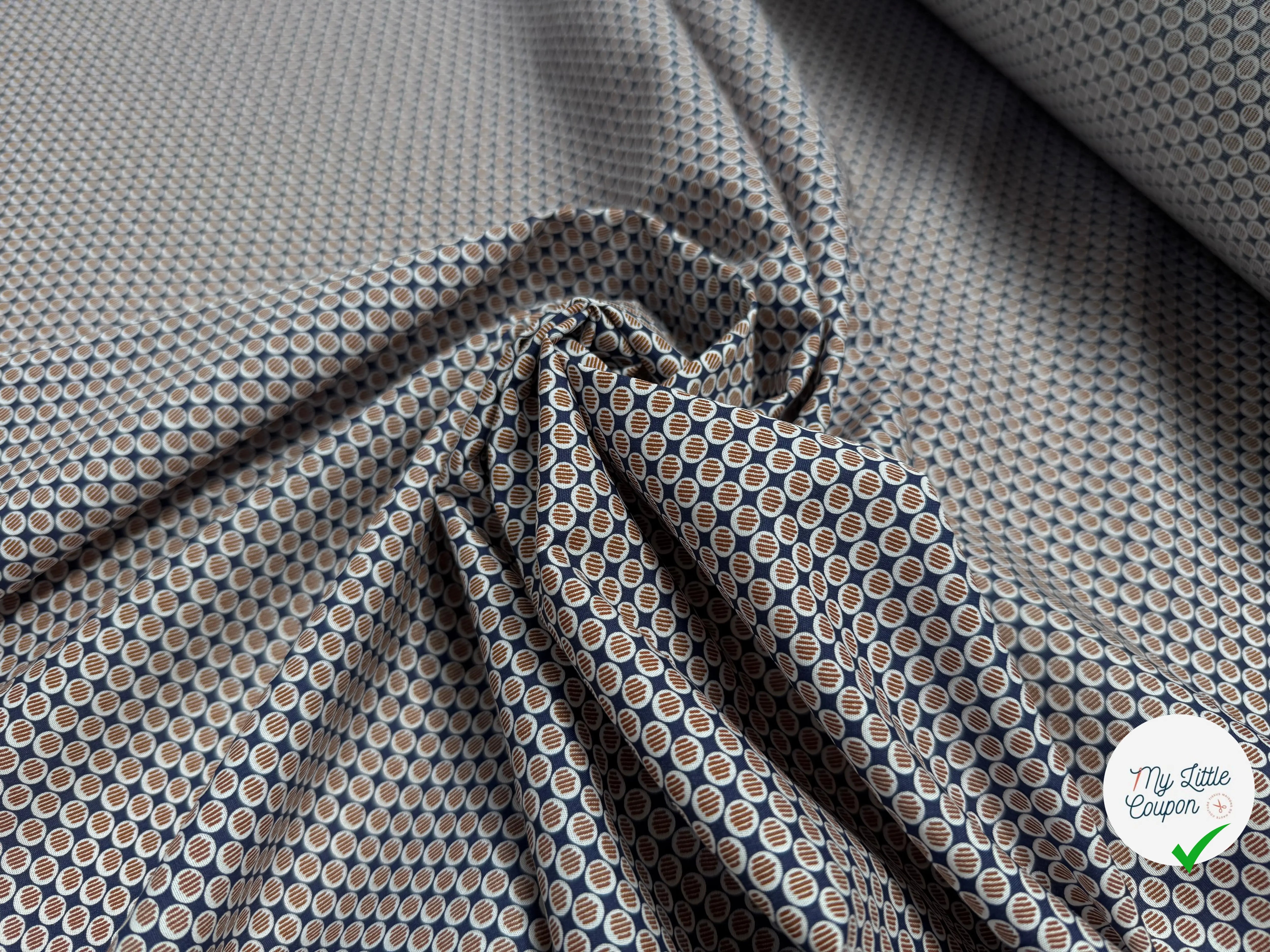 Its geometric circular pattern on a blue background gives this material a modern and sophisticated look. The 100% cotton composition ensures comfort and ease of care, making this poplin a preferred choice for creating durable and elegant pieces.
