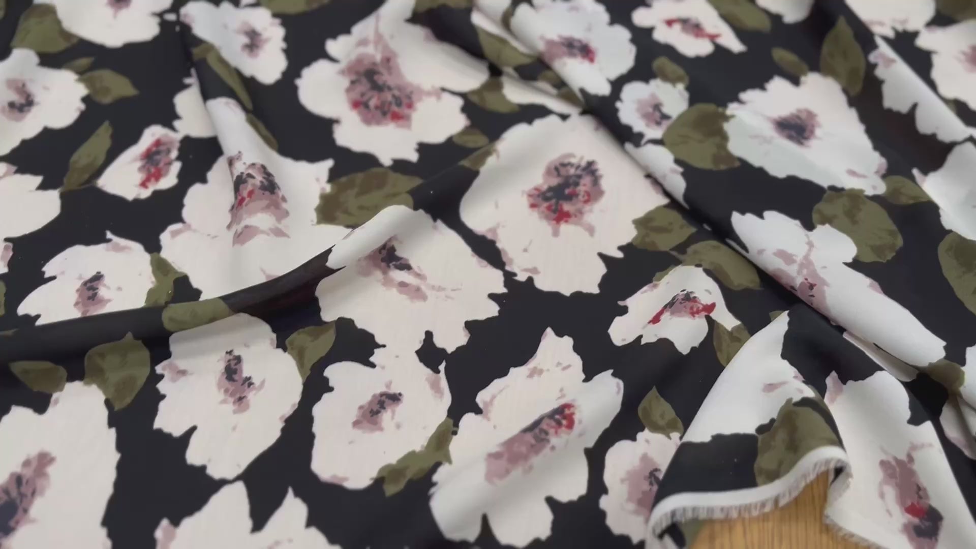 CREPE fließend PRINTED LARGE FLOWERS ON BLACK BACKGROUND