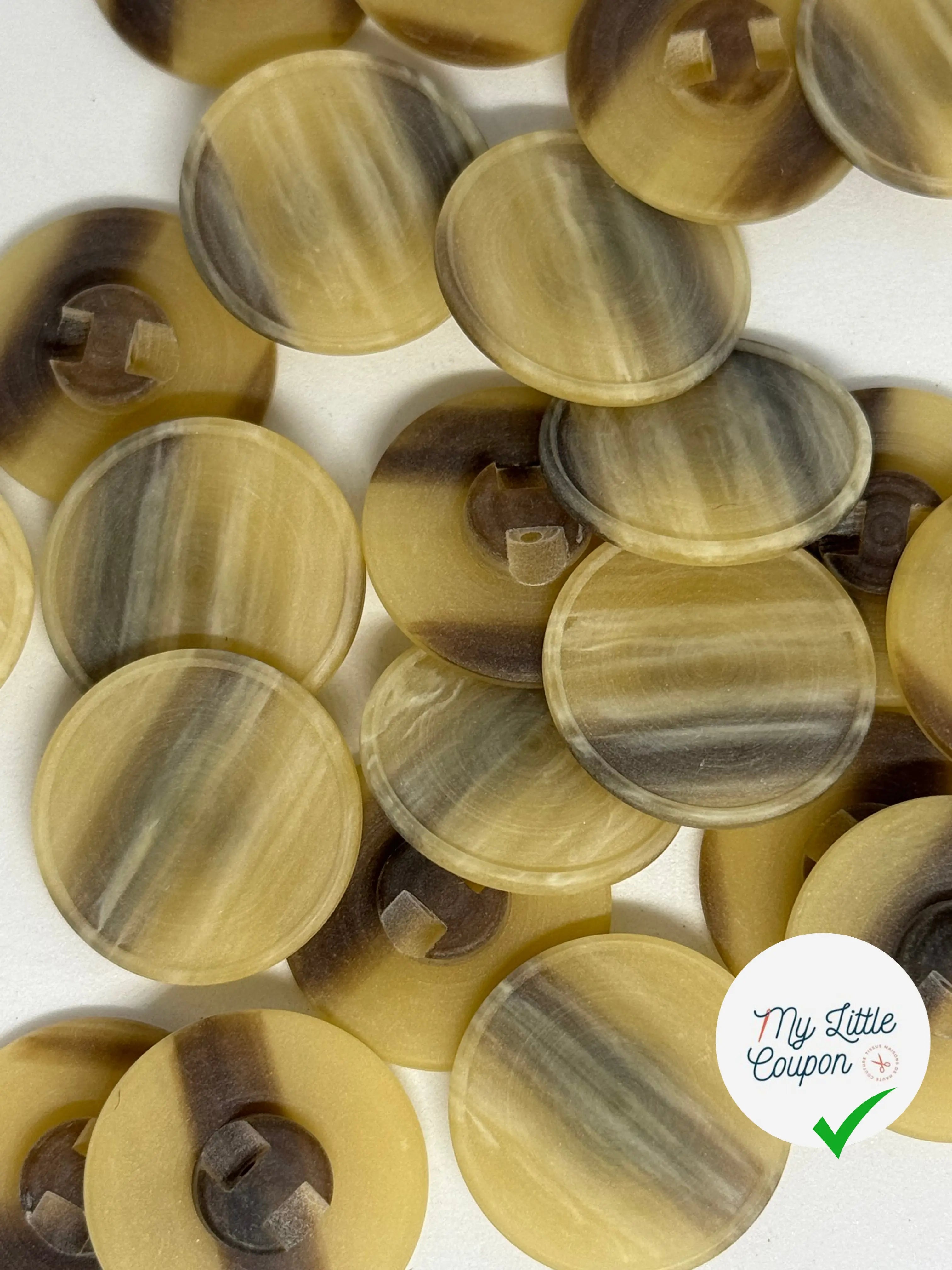 Avec un diamètre de 22 mm et une épaisseur de 2 mm, ce bouton allie légèreté et robustesse grâce à sa conception en PVC de haute qualité. Son design marbré s’harmonise avec une large variété de tissus, des pièces classiques aux créations modernes.