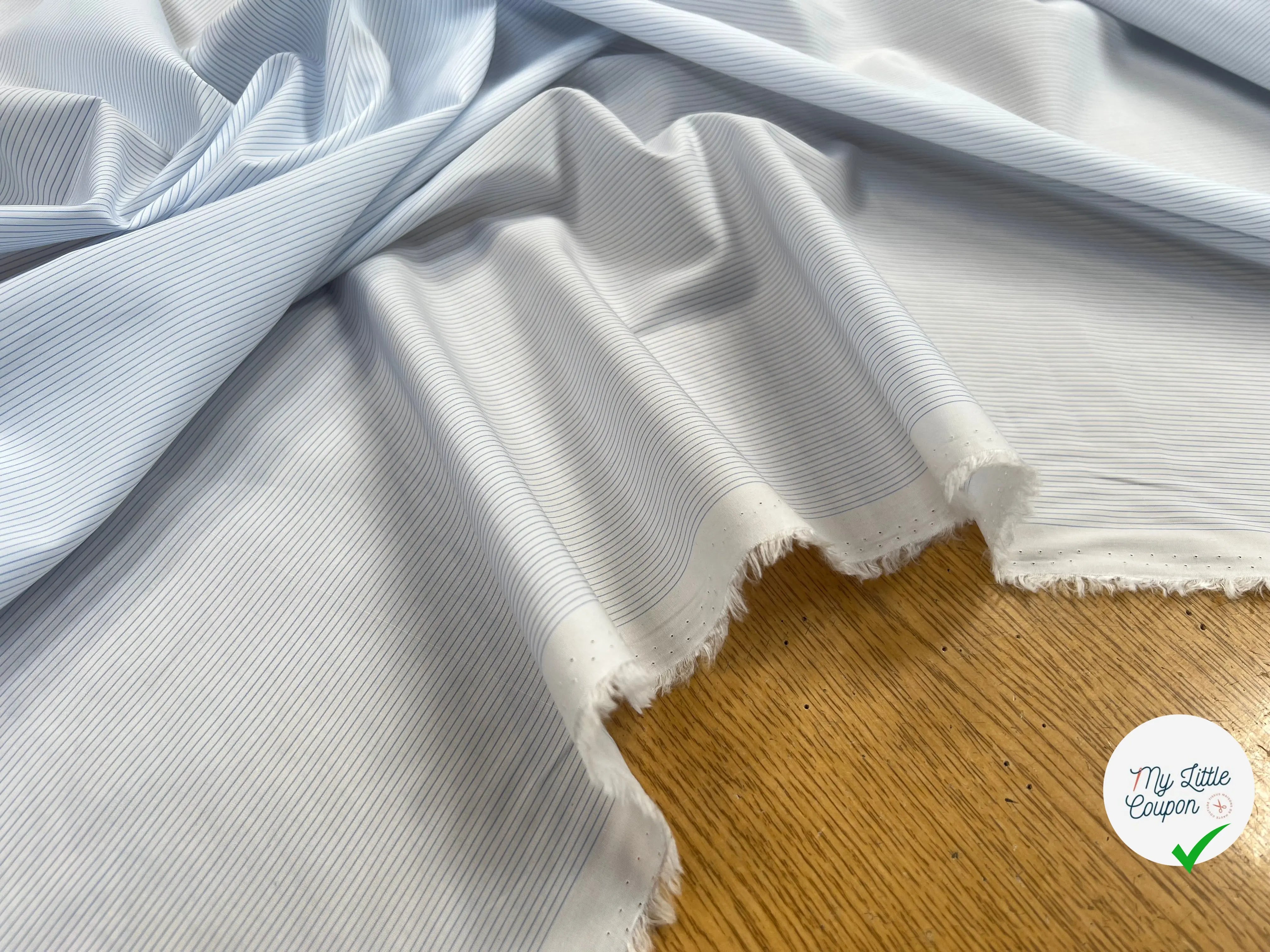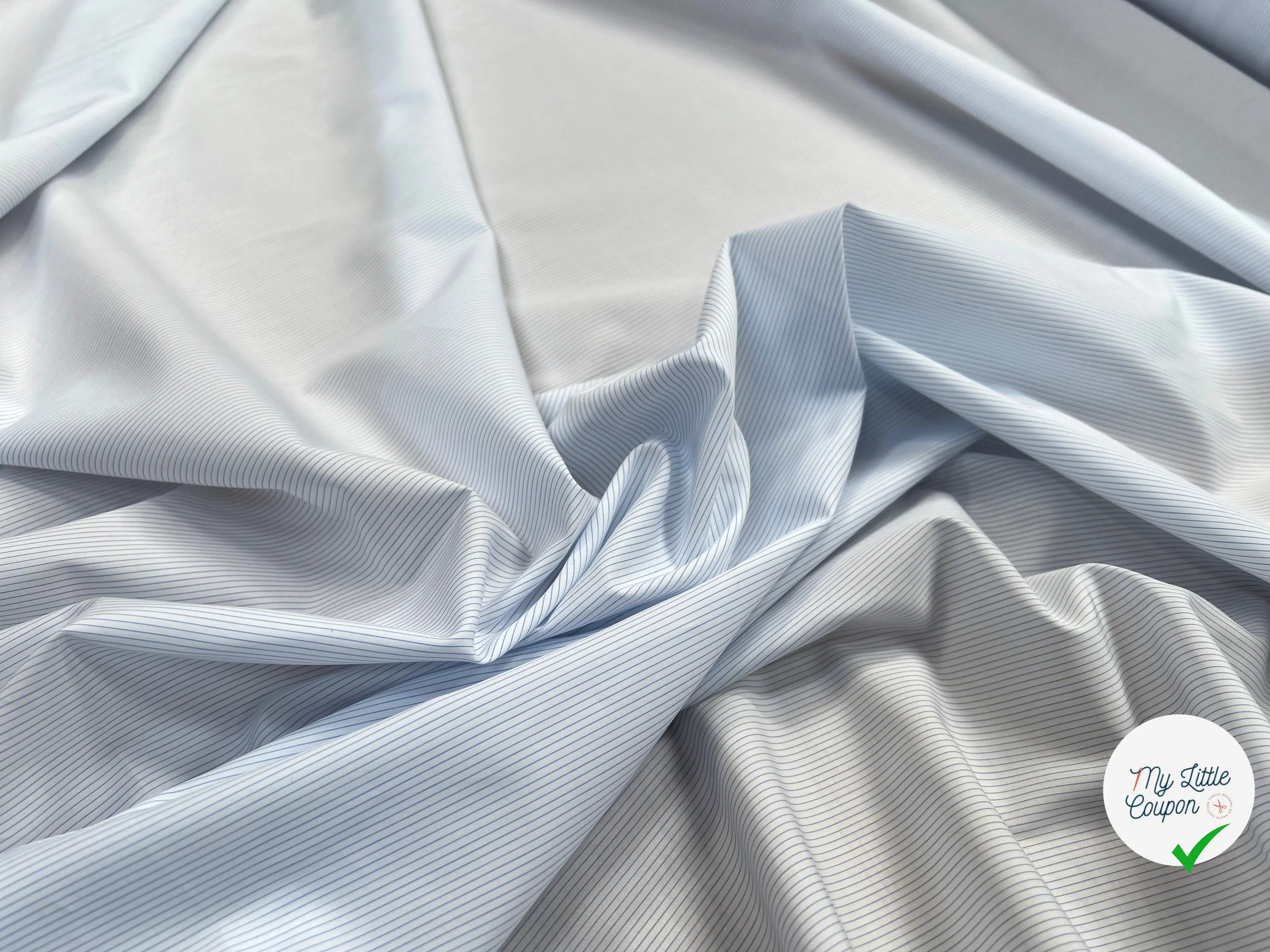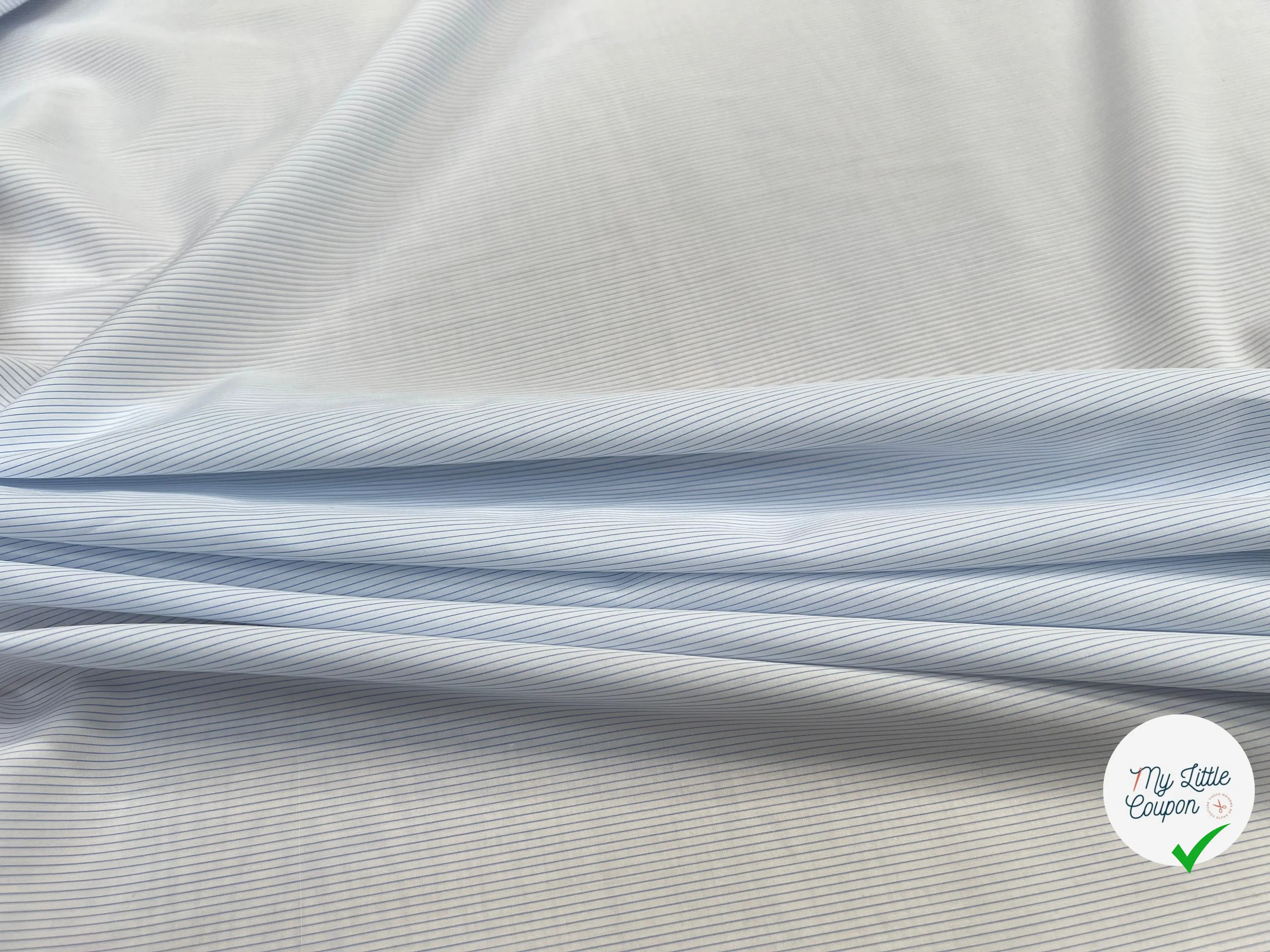 Descubra nuestra magnífica tela de popelín de algodón blanco con finas rayas azules, una tela de lujo en fin de rollo cuidadosamente reciclada por nuestro equipo. Proveniente de Italia, esta tela se distingue por su calidad premium y su cantidad limitada, perfecta para sus proyectos de costura más refinados.