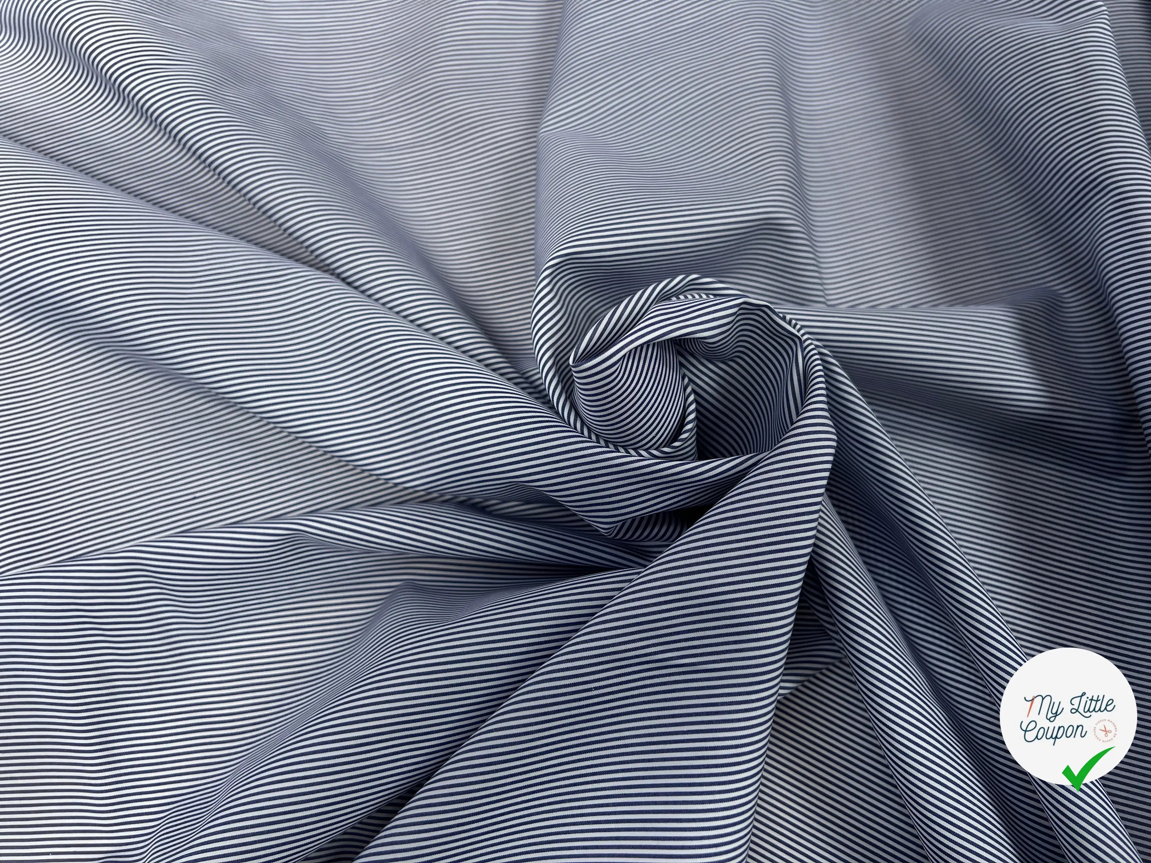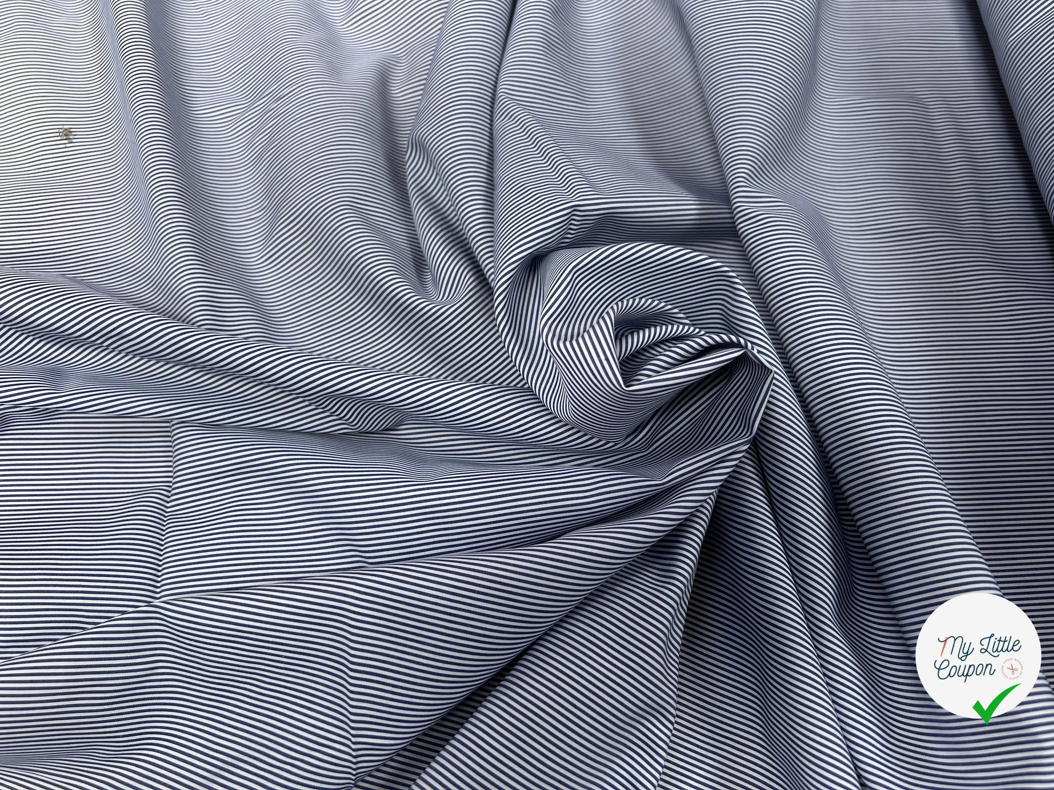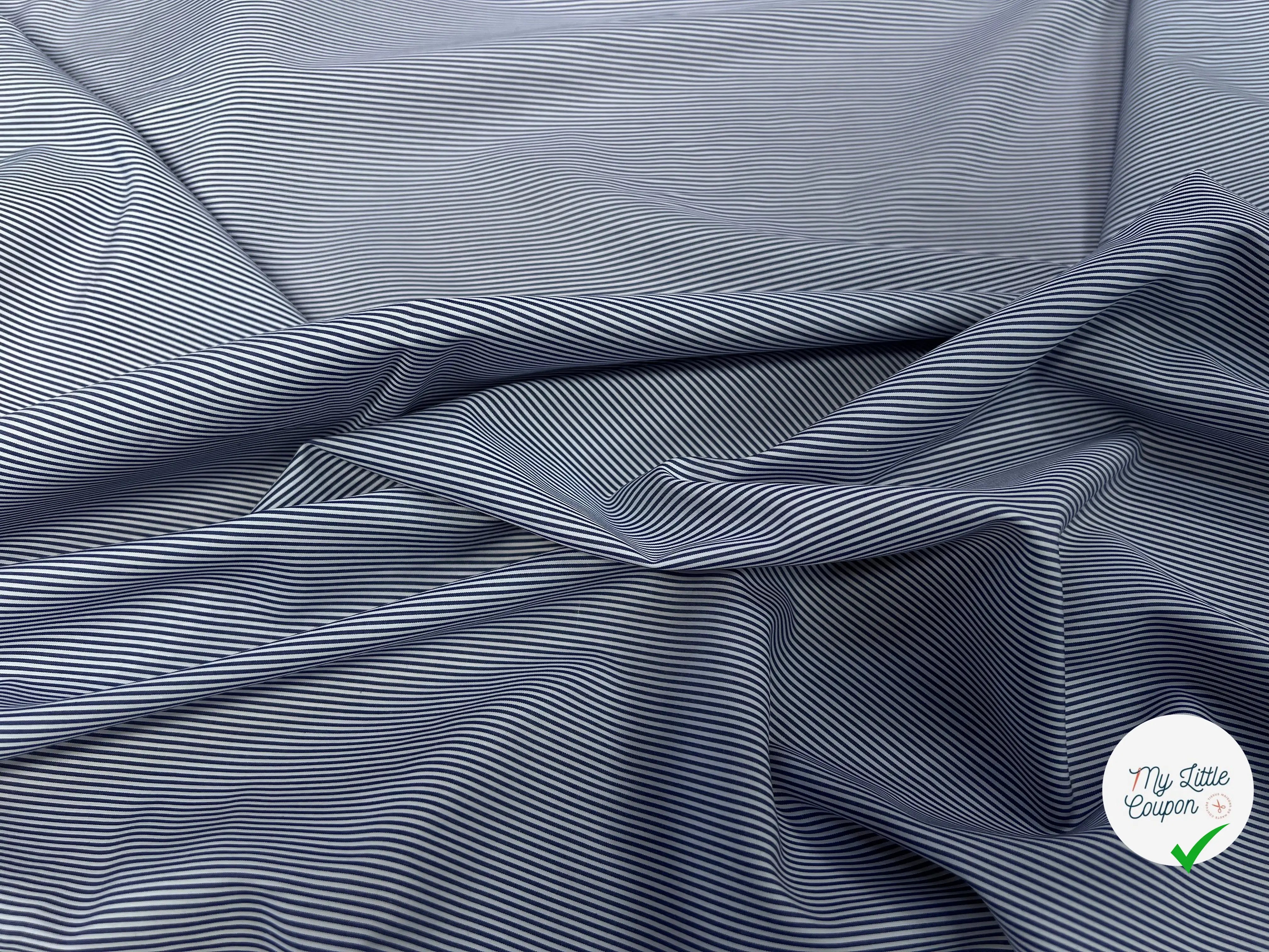 Descubra nuestra magnífica popelina de algodón a rayas marino blanco, una tela de lujo de fin de rollo cuidadosamente reciclada por nuestro equipo. Originaria de Italia, esta tela de calidad superior está disponible en cantidad limitada, lo que la convierte en una pieza única para sus creaciones.