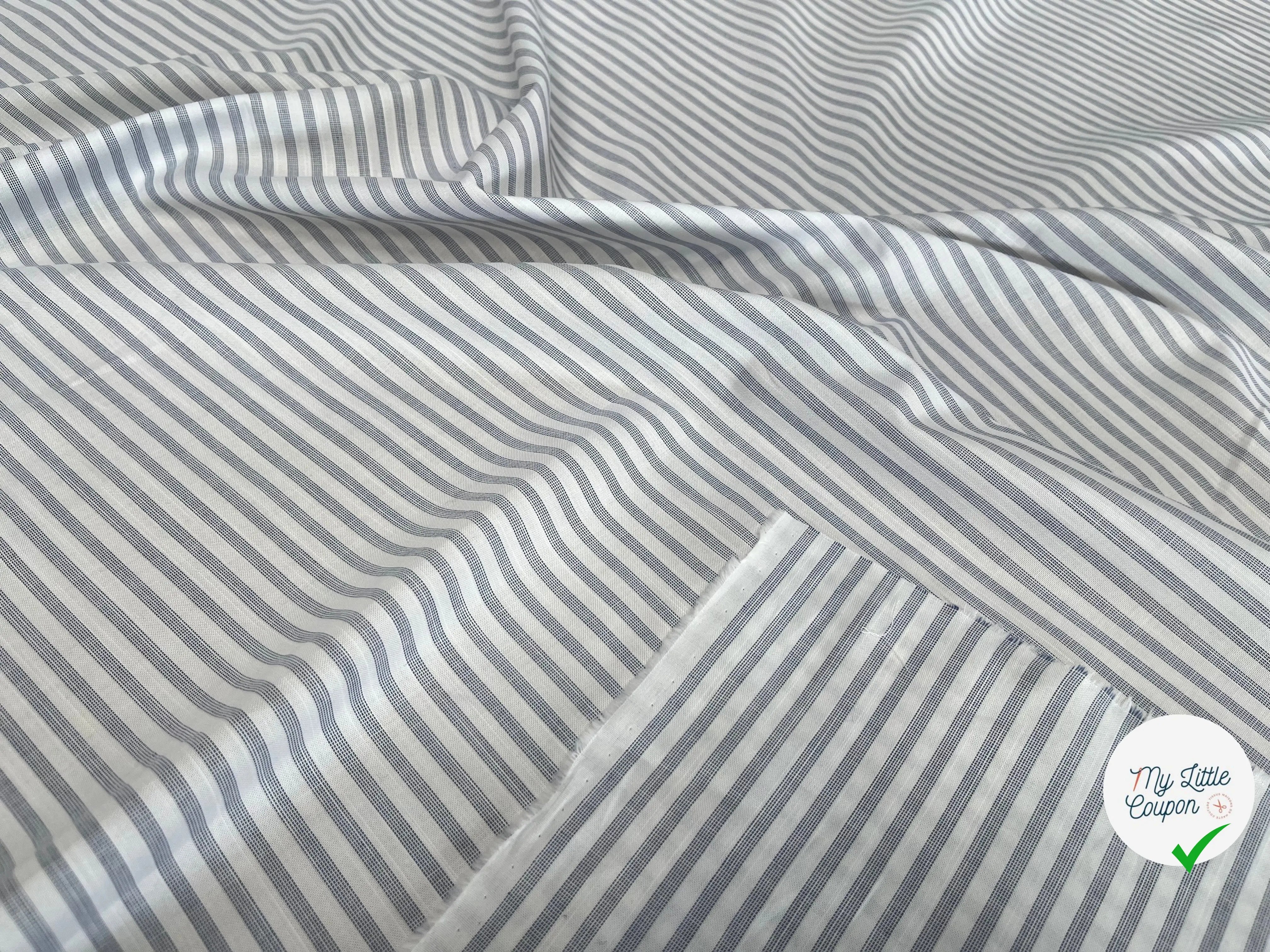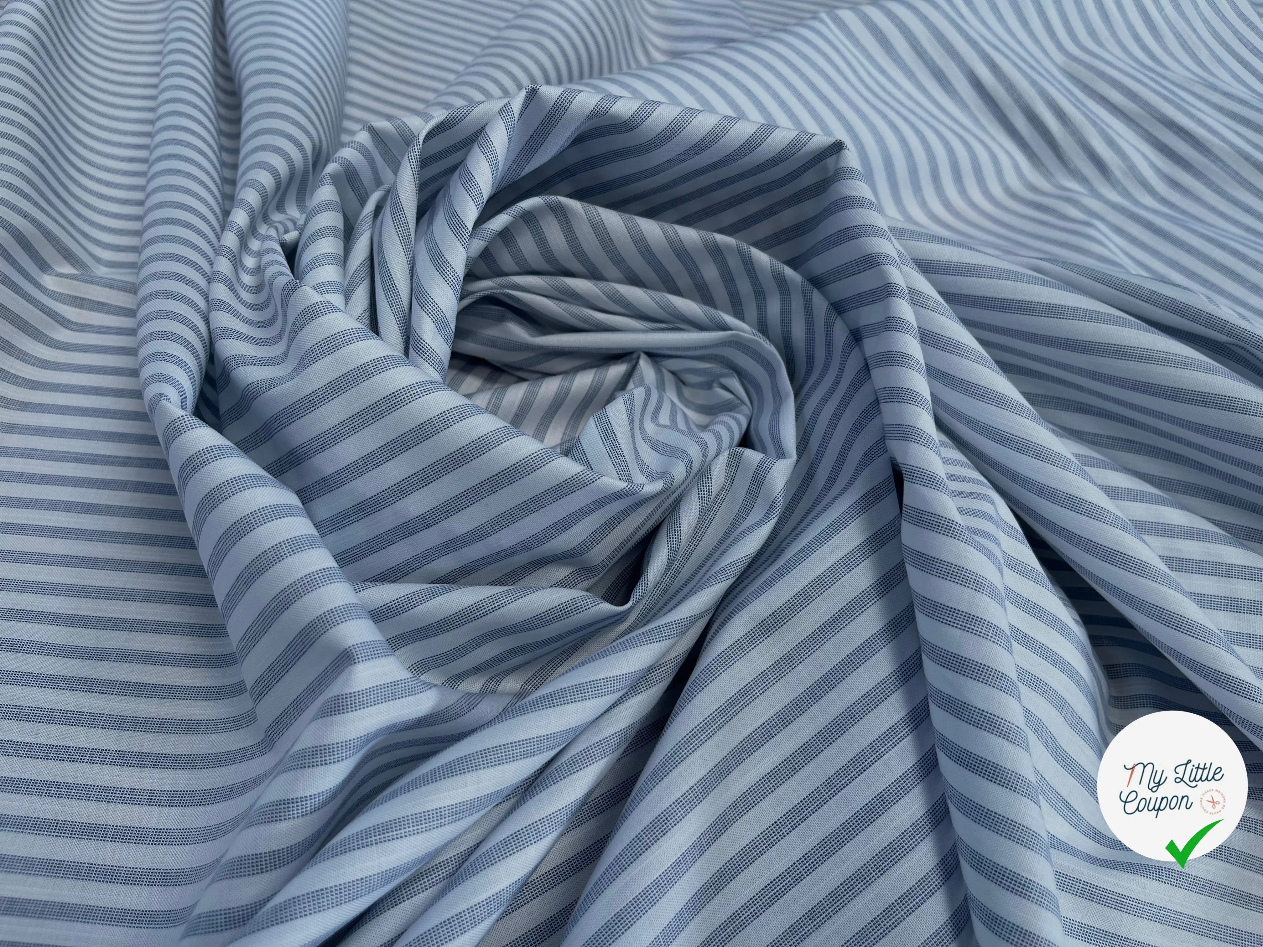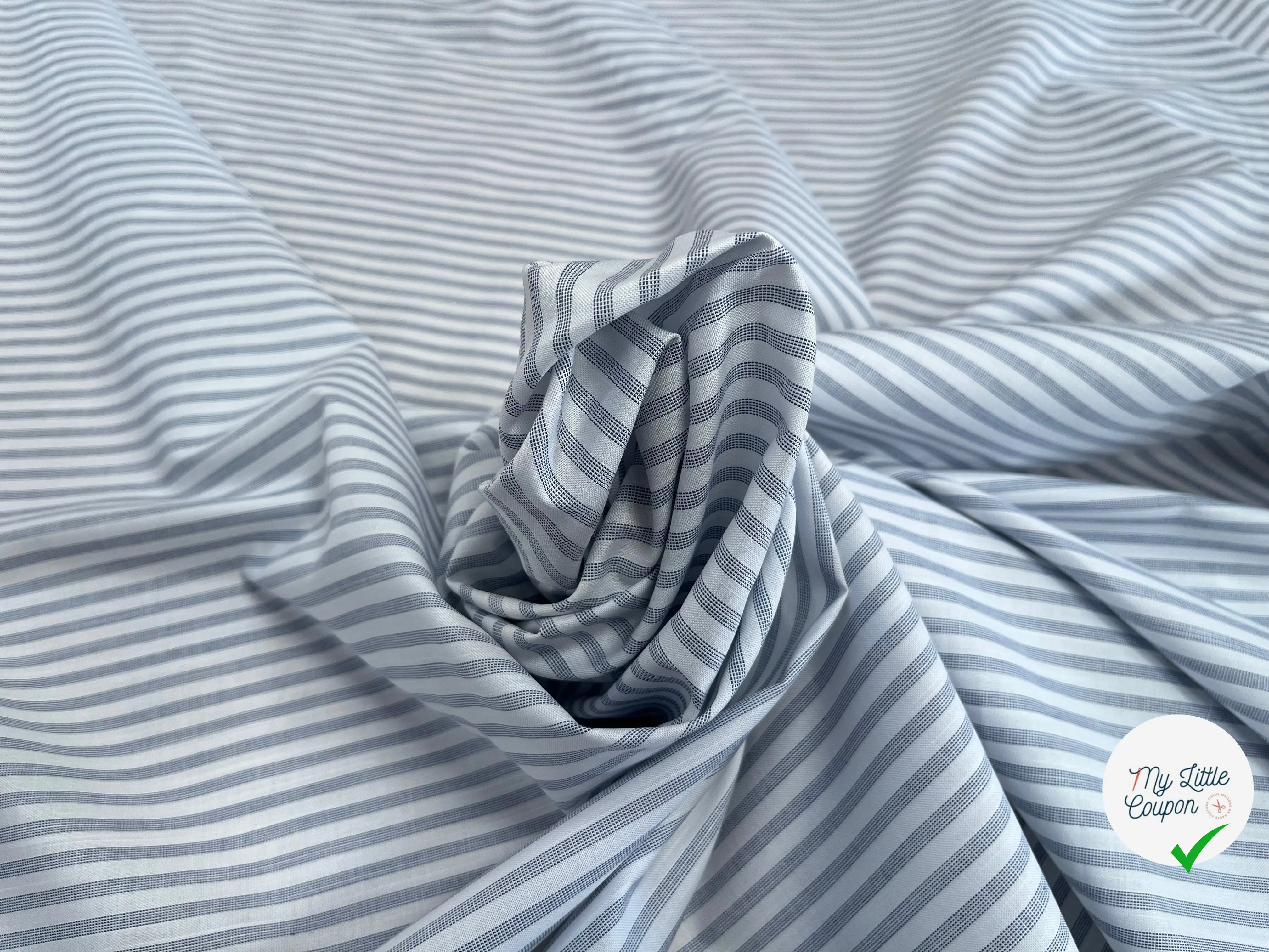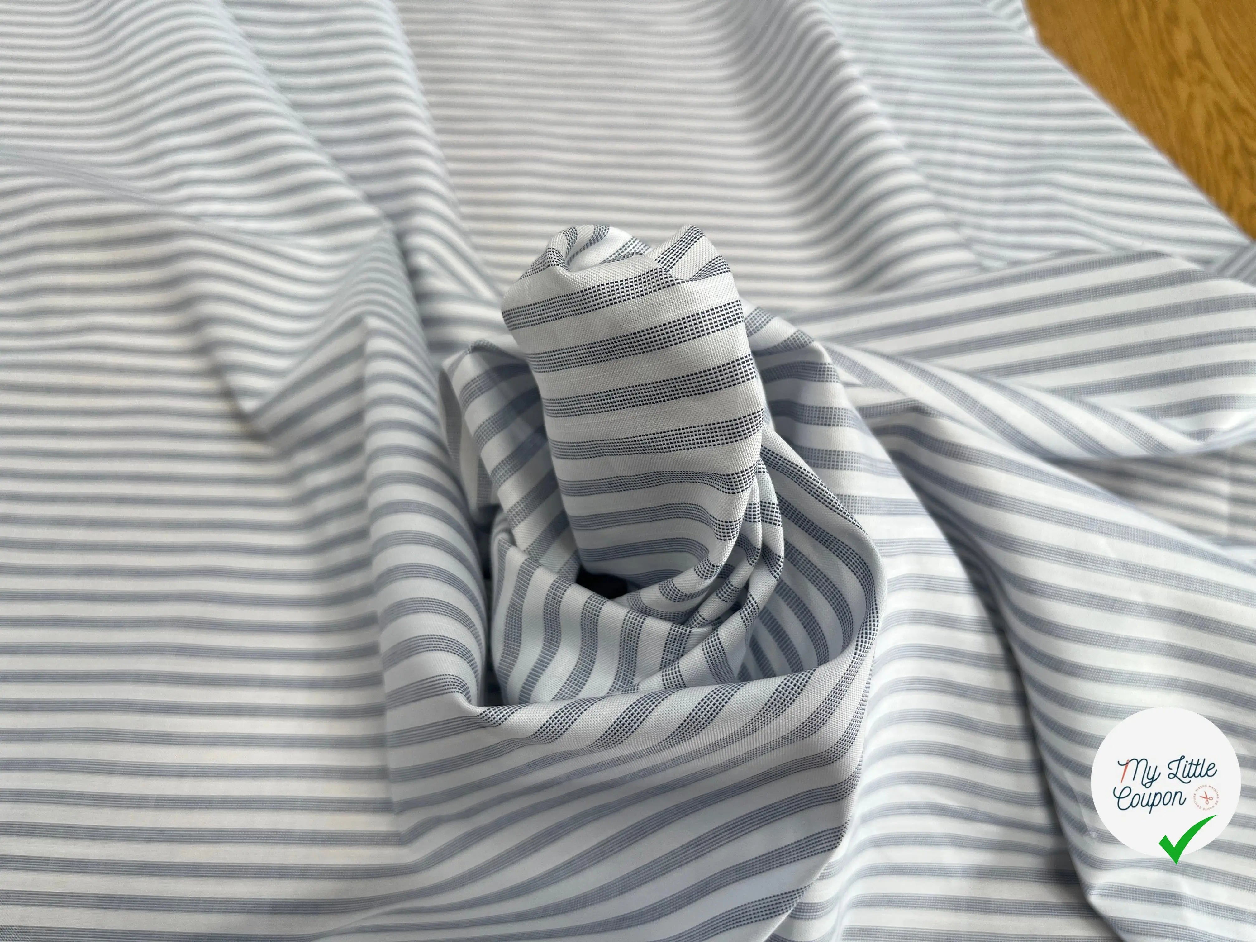 Descubre nuestra magnífica popelina de algodón a rayas azul sobre fondo blanco, un tela de lujo en final de rollo, cuidadosamente revalorizada por nuestro equipo en Francia. Originaria de Italia, esta tela de primera calidad es en cantidad limitada, perfecta para tus proyectos de costura más refinados.