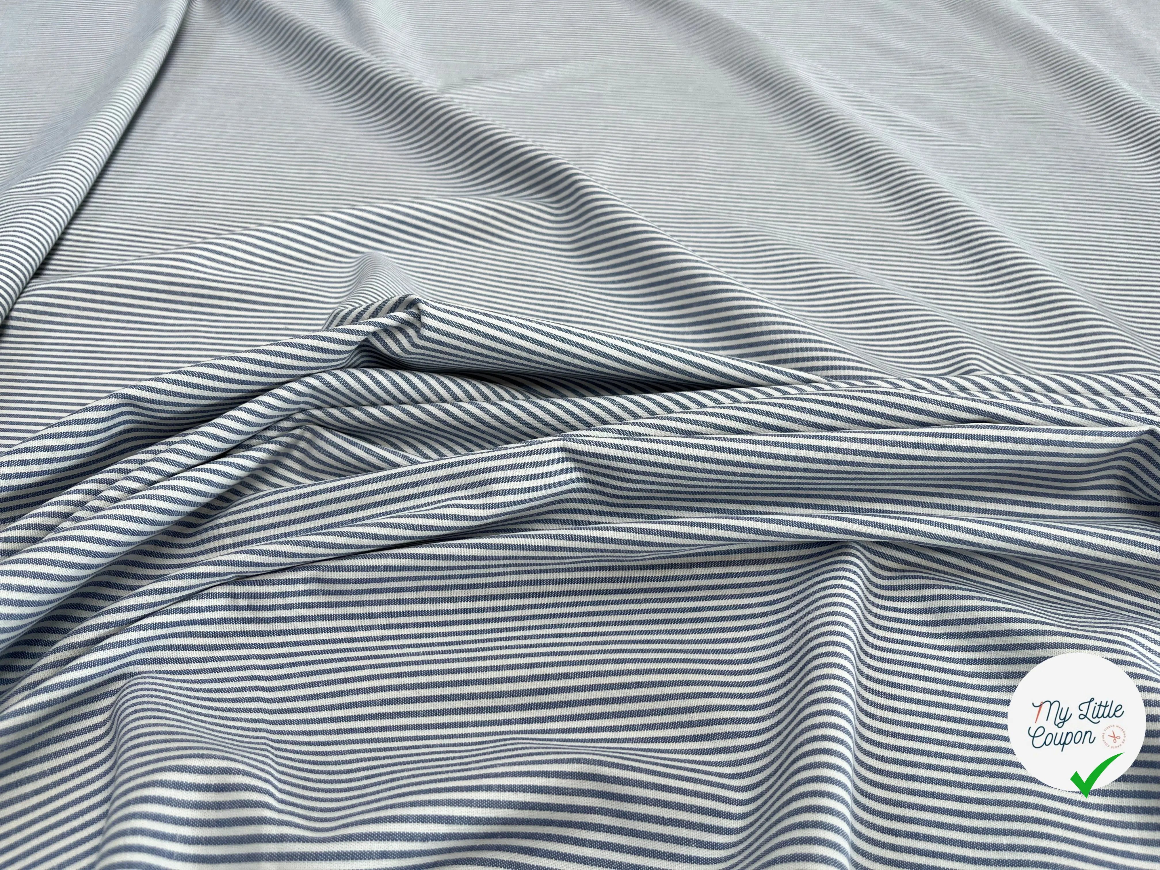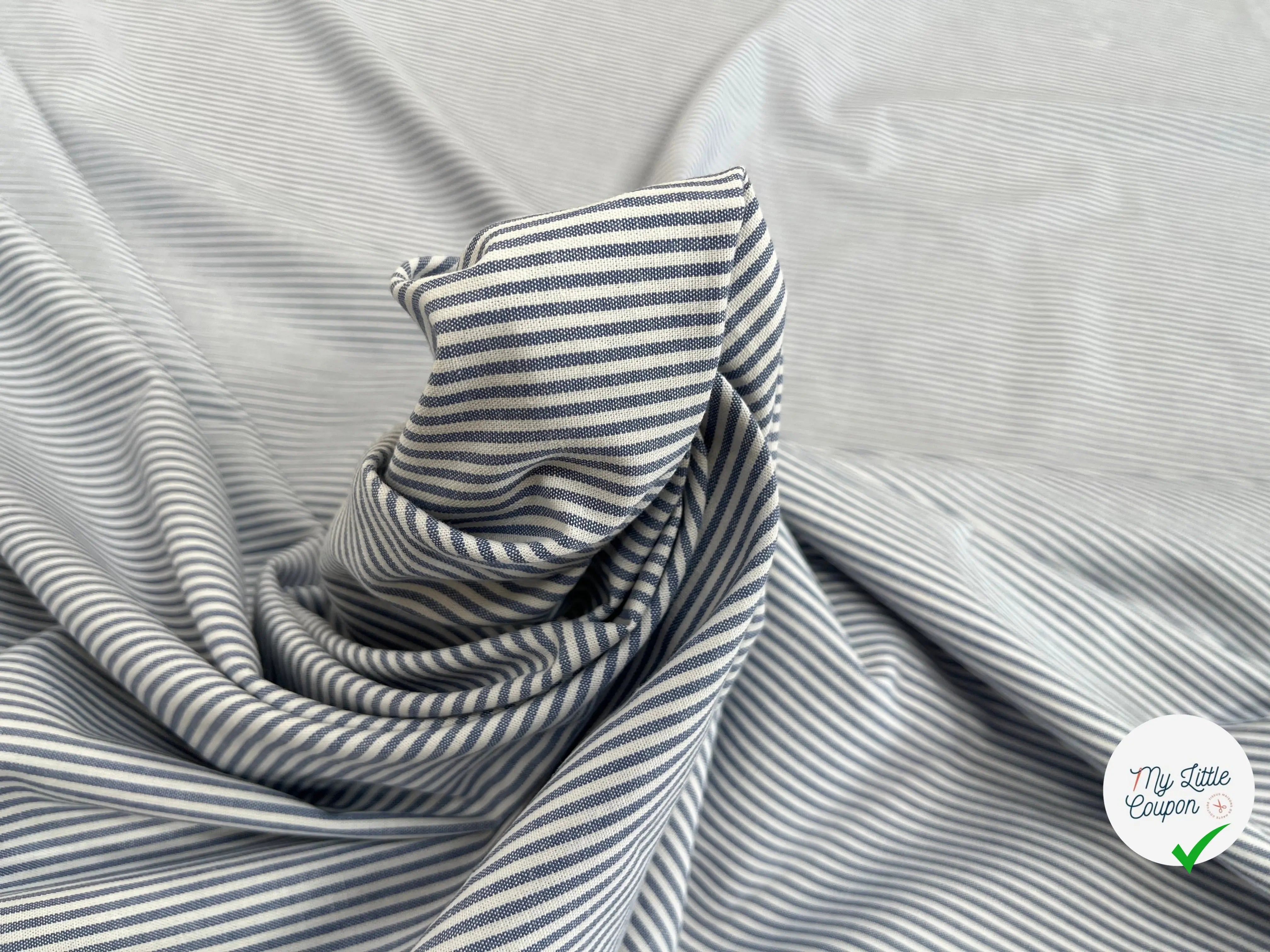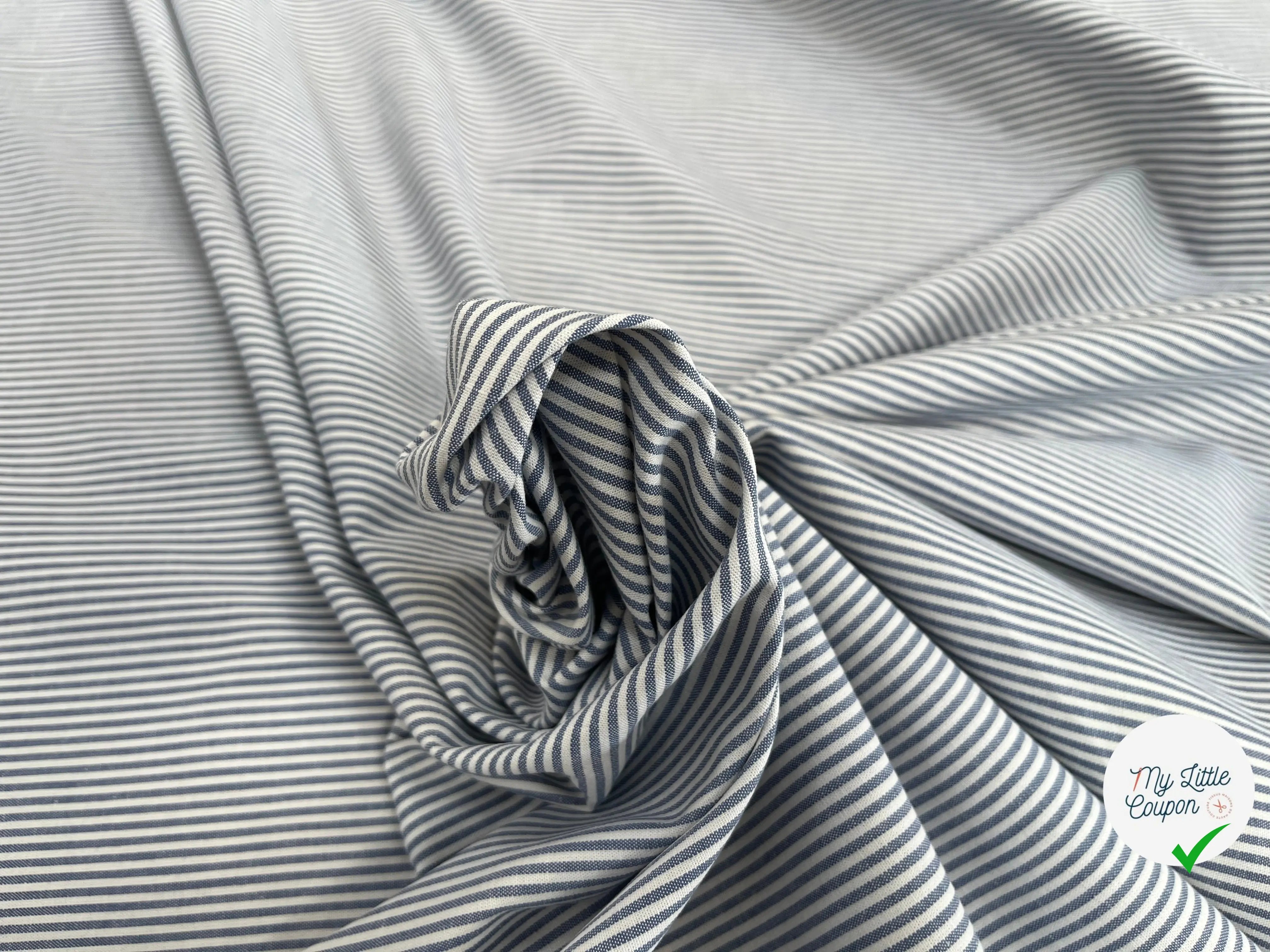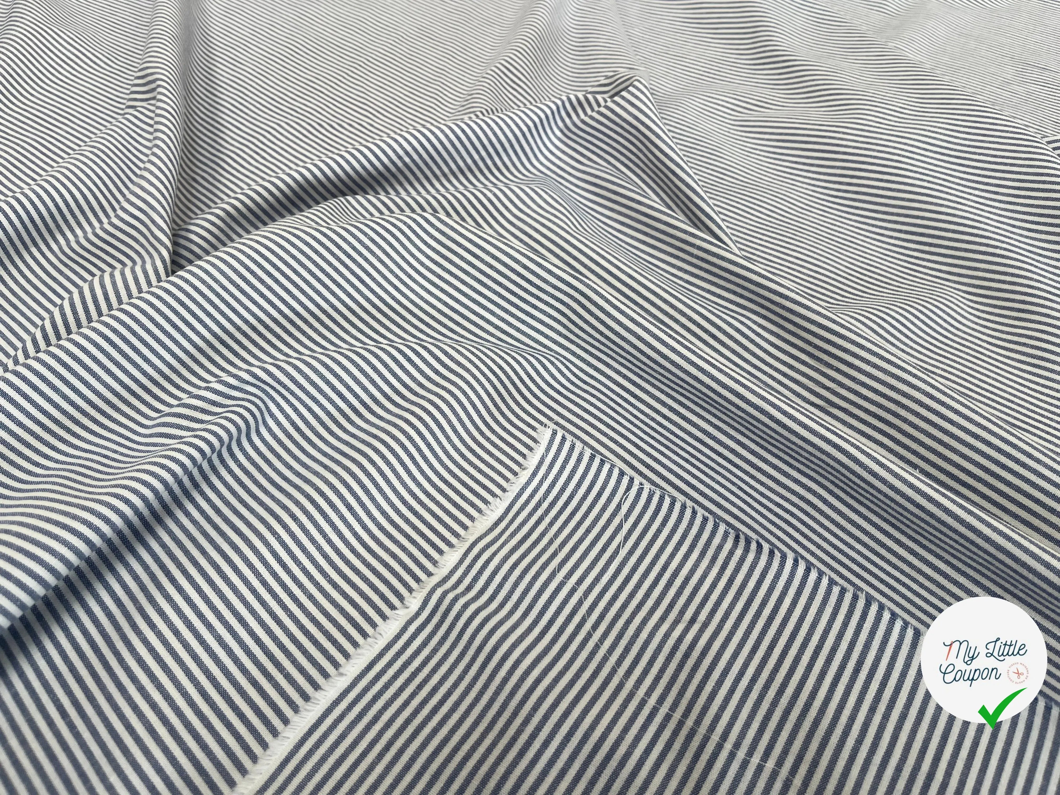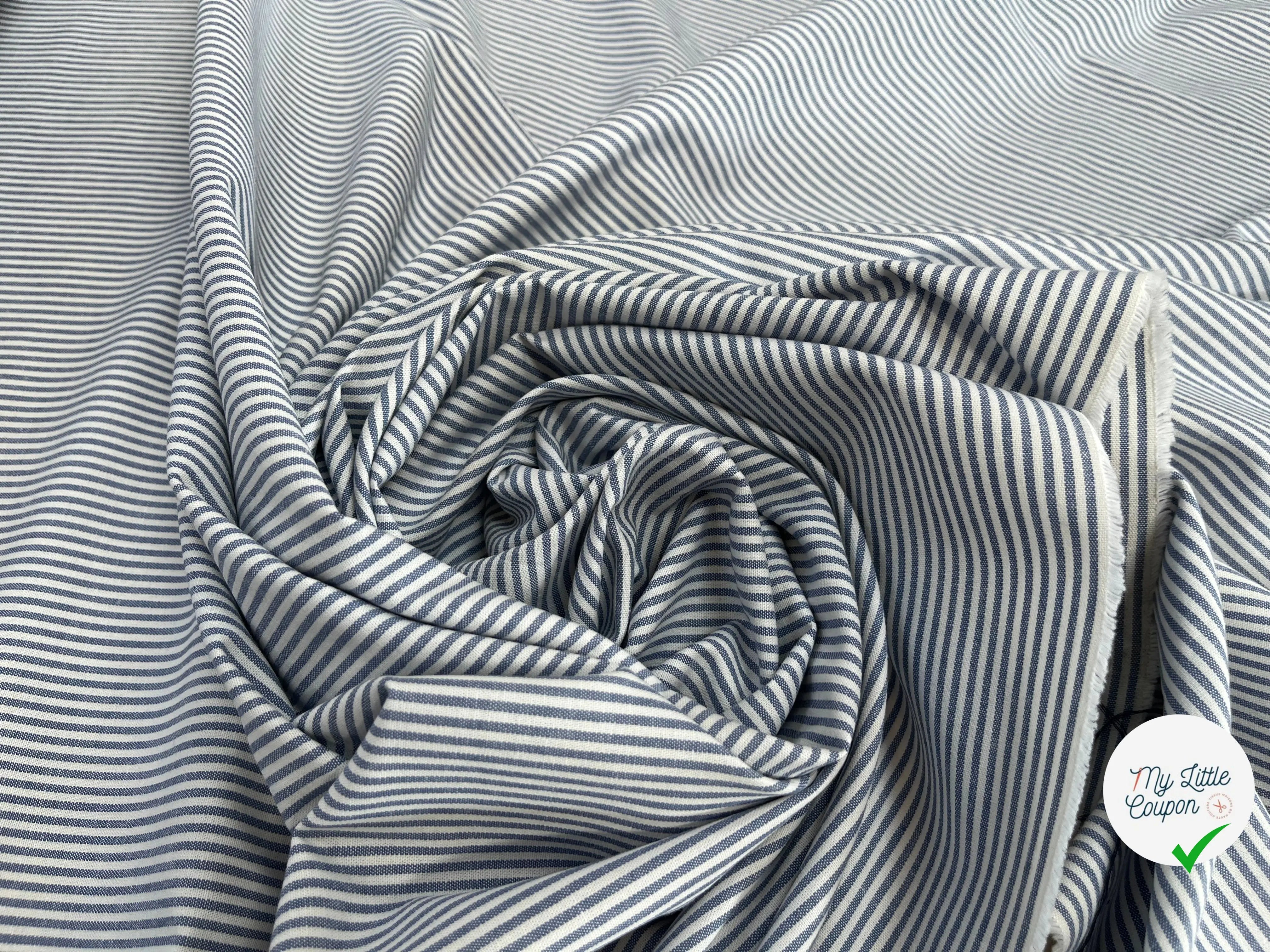 Descubre nuestra magnífica popelina de algodón a rayas azul y blanco, un tela de lujo en fin de rollo, cuidadosamente revalorizada por nuestro equipo. Fabricada en Italia, esta pieza rara es de calidad premium y en cantidad limitada, perfecta para tus proyectos de costura creativos.
