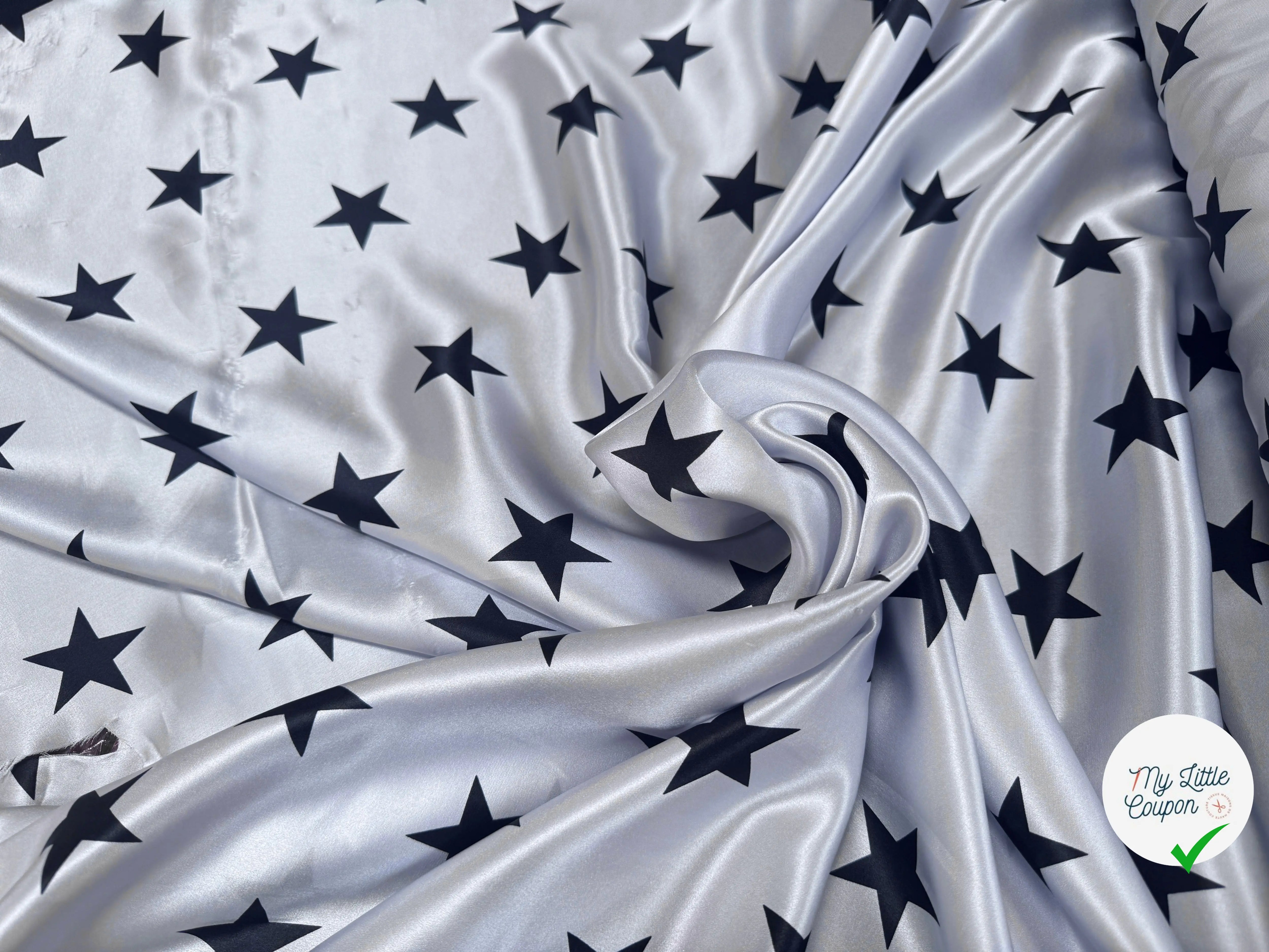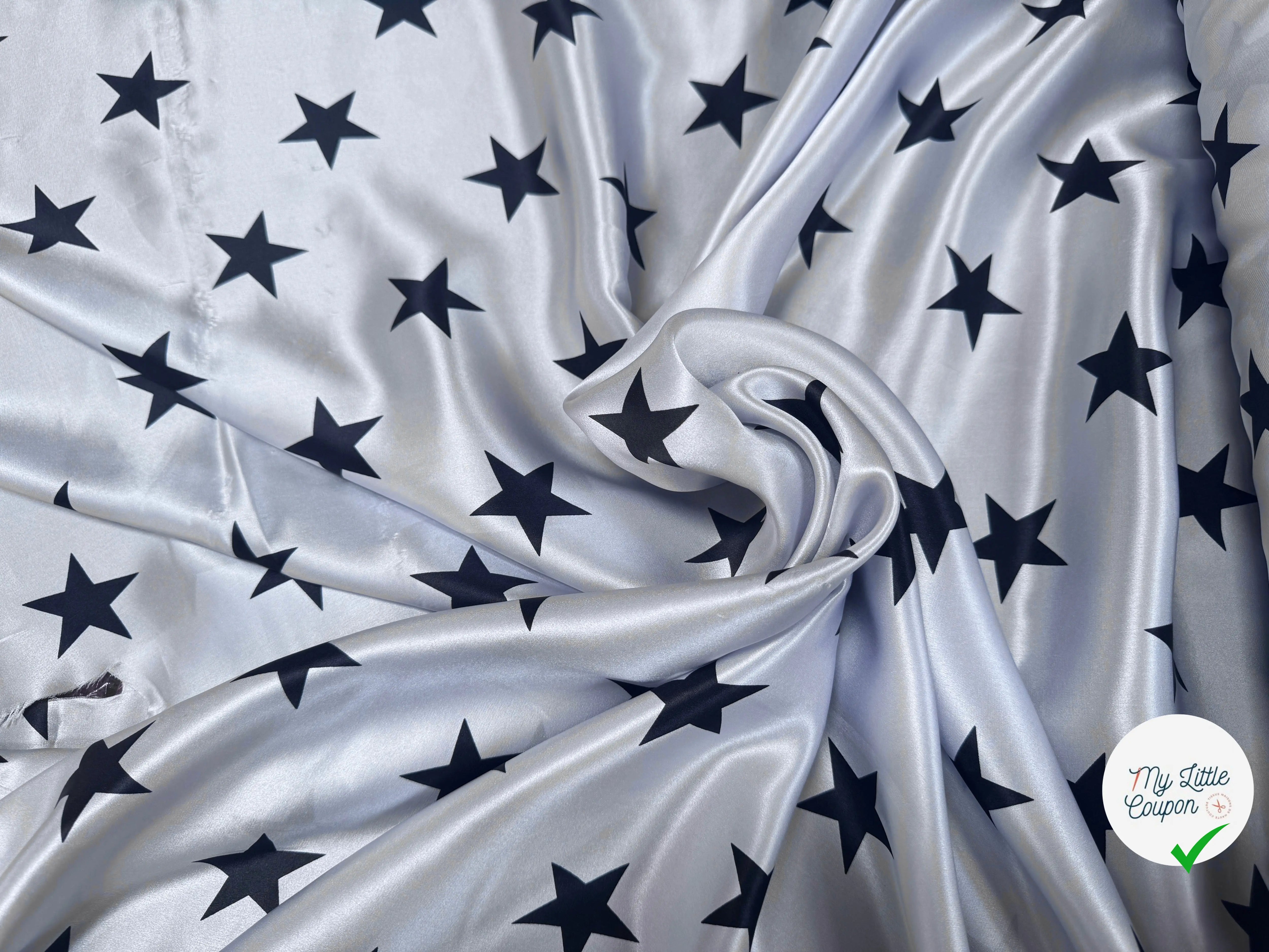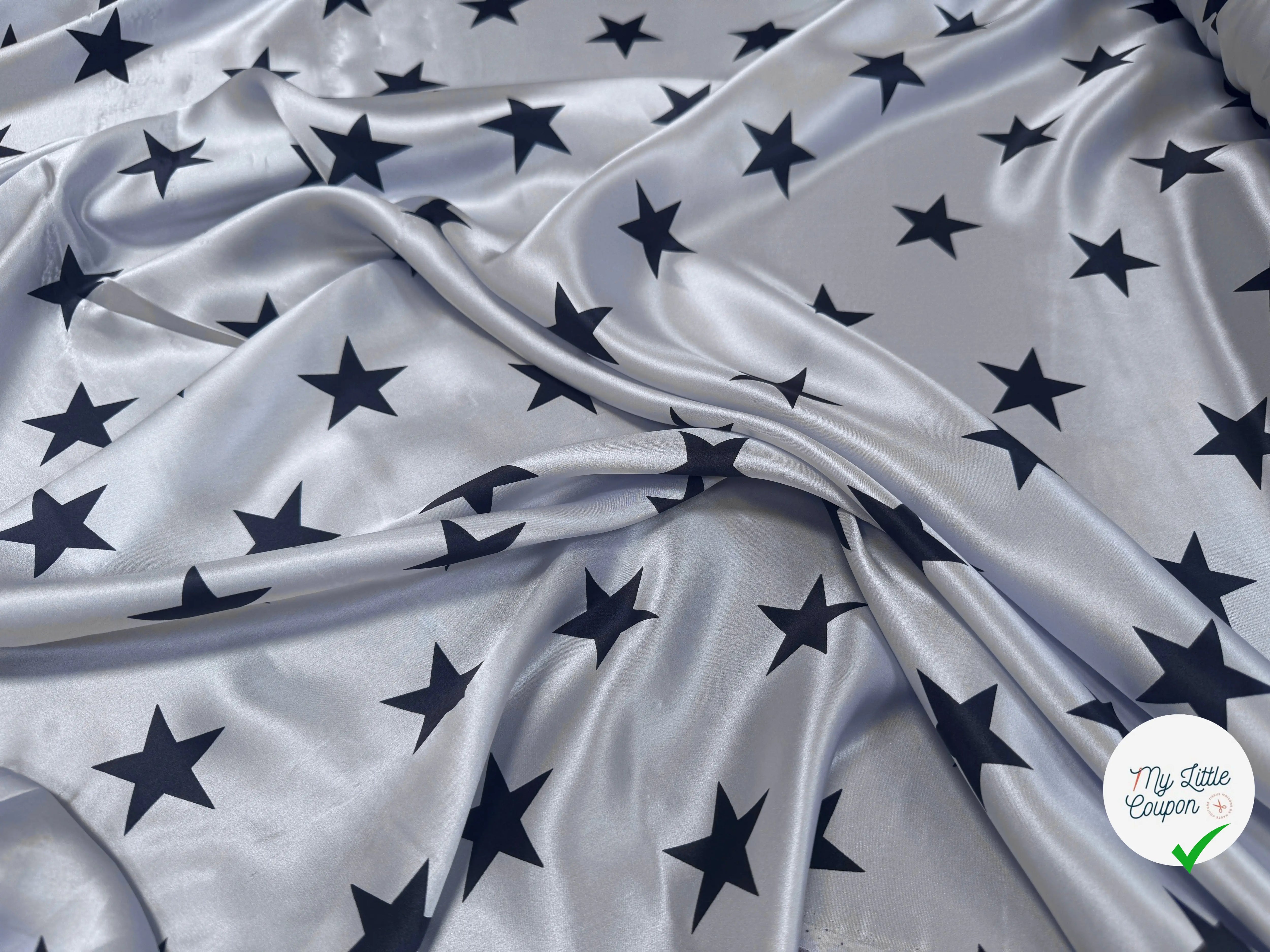 Descubra nuestro suntuoso satén de seda, sublimado por un elegante patrón estrella. Esta lujosa tela, completamente hecha en Italia, es de calidad excepcional, que garantiza una suavidad incomparable y un toque delicado.