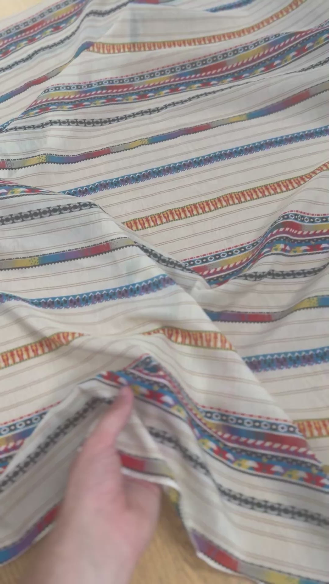 Scoprite il nostro tessuto di cotone seta fondo beige motivi hippie, un tessuto eccezionale realizzato in Italia. Con una larghezza di 137 cm, questa miscela perfetta di 50% cotone e 50% seta unisce comfort ed eleganza. Leggero con 60 g/ml, è ideale per i vostri progetti di cucito, che si tratti di abbigliamento, accessori o decorazioni per interni. La sua delicata tonalità beige e i suoi motivi hippie conferiscono un tocco bohémien alla vostra collezione.