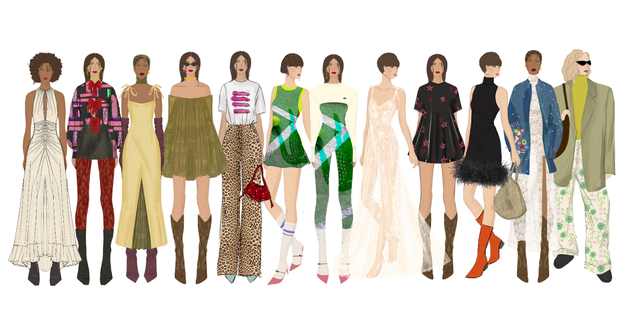 Dessins des silouhettes clefs de la collection, plan de de collection, details stylisme & proposition de looks complets (Propositions de look complet (associations des pièces et accessoires accordés à la DA).