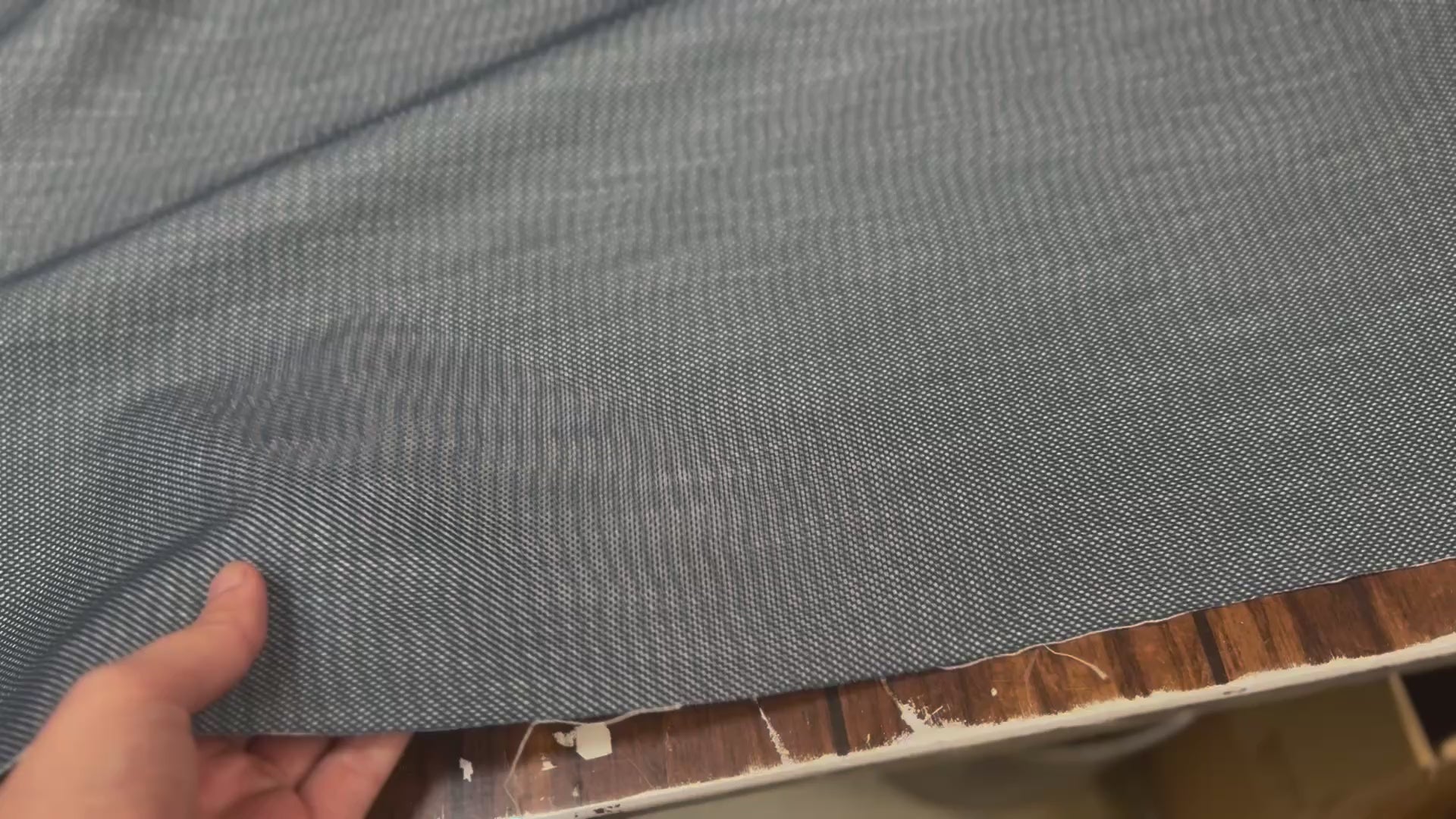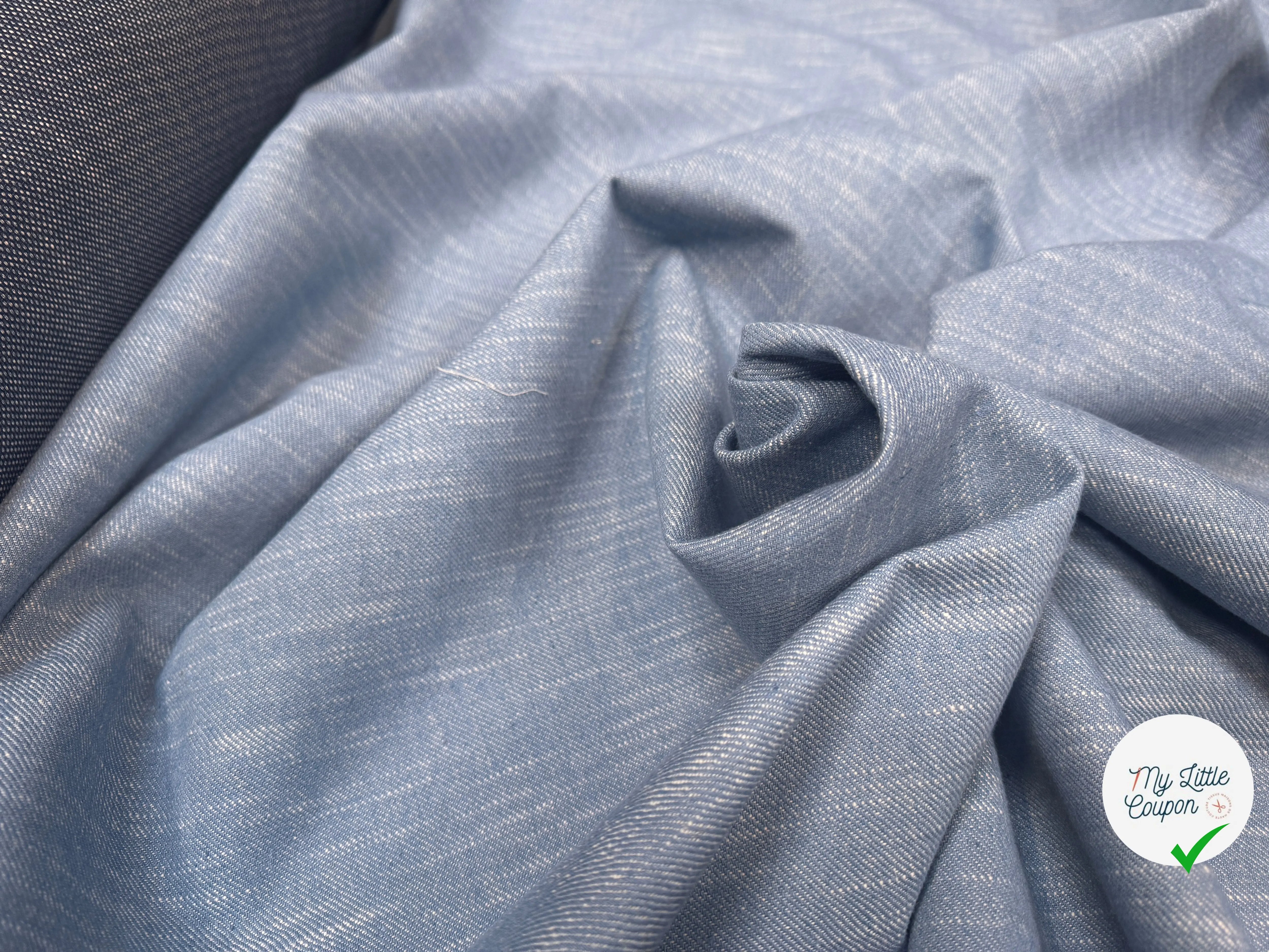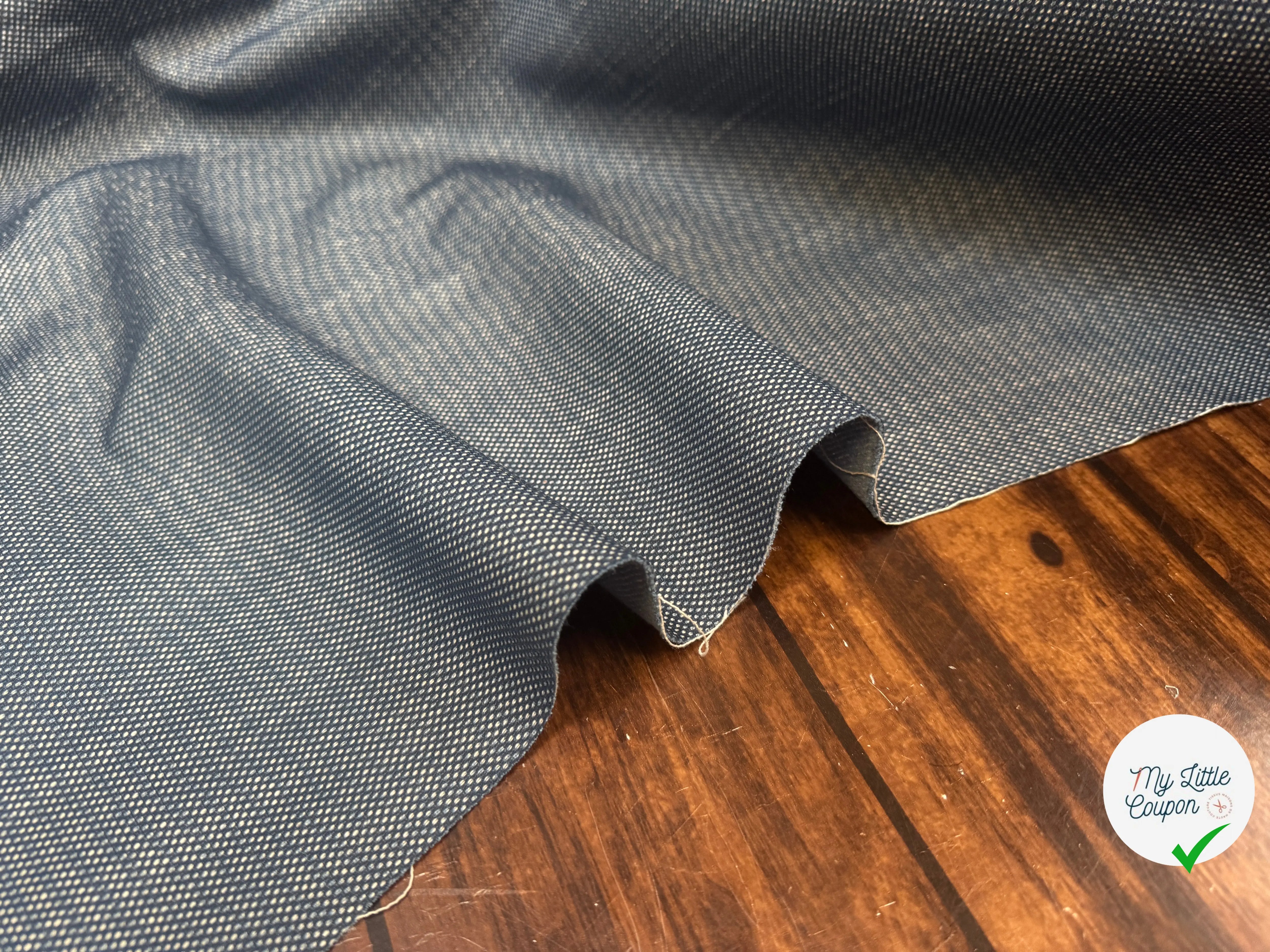 Toile technique mesh bleue avec une face mesh et une face drill effet jean. Idéale pour des projets innovants tels que des vestes légères, sacs ou accessoires sportifs.